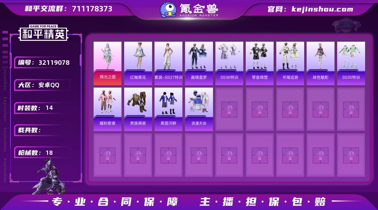 【和平精英】2粉装,4特效枪,0载具,历史最高段位:传奇王牌15星 王牌印记2次 热力值:14723,37套装,58枪械,64装备,29战备;套装:角色-辉光之愿,角色-虎痴许褚,套装-蓝色运动,套装-竞技名士,套装-黄色名流,套装-长空猛禽,套装-浪漫天命,套装-贵族骑装,套装-魅力单车,套装-绮丽涂鸦,套装-潮流炫酷,套装-夏日倾情,套装-青涩时光,套装-破蛋小黄鸡,套装-疯狂小兔子,套装-白糯汤圆,套装-狙击之神,套装-耀粉歌者,套装-绯格组合,套装-莱茵河畔,套装-王牌教练,套装-云魄琉璃,角色-绯色魅影,套装-青翼流星,套装-SS35特训,套装-琴音绮想,套装-画境星梦,套装-书海巡游,套装-SS37特训,套装-SS36特训,套装-红釉青花,套装-雪国风尚,套装-雨过天青,套装-萌鸡速递,角色-魂电,套装-福马献瑞,套装-马上有钱;枪皮:AKM-龙的传人,AKM-霓彩脉冲,3级ACE32-萌骑漫游,ACE32-画境星梦,ACE32-冰晶雪宝,GROZA-影袭,GROZA-福马献瑞,SCAR-L-夜灯,SCAR-L-绿洲时空,M16A4-雨过天青,M762-彩虹符号,Famas-霓彩脉冲,4级AUG-罪夜之冕,蜜獾-启元战纹,AMR-雨过天青,Win94-乌木金纹,M24-炫彩节奏,SVD-霓彩脉冲,M200-罪夜之冕,M200-闹岁年君,MK20-H-狂鲨锋刃,Mini14-穿刺龙虾,SKS-炫彩节奏,M1加兰德-画境星梦,SLR-霓彩脉冲,SLR-乌木金纹,5级Mk14-福马献瑞,Mk14-阳光菠萝,MK12-乌木金纹,5级AKS-74U-森灵之息,汤姆逊-天降萌叽,汤姆逊-像素花束,UMP45-夜灯,UMP45-春暖花开,MP5K-画境星梦,UZI-啾咪啾咪,P90-紫矿核心,SPAS-12-狂鲨锋刃,SPAS-12-福马献瑞,AA12-G-画境星梦,AA12-G-雨过天青,S686-千金淑猫,DBS-第五大道,S12K-夜灯,MG-36-薄荷星砂,MG3-幻世战舞者,MG3-火熔核心,M249-冰晶雪宝,PKM-雨过天青,沙漠之鹰-雨过天青,蝎式手枪-虹云熊熊,P92-闹岁年君,撬棍...