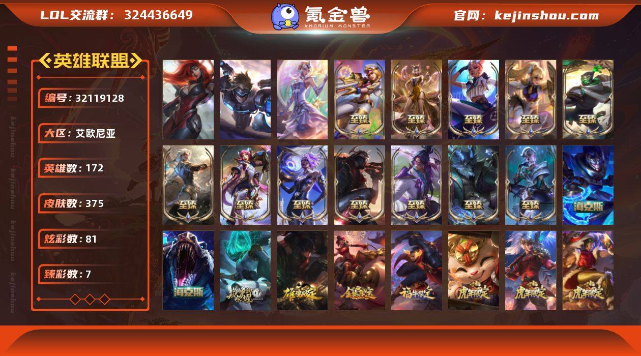 t37381【艾欧尼亚】375皮肤 81炫彩 7臻彩 17神话/57限定/41传说/172英雄 账号等级:385 【重要头像】至爱的鹿 雪花 KDA卡莎 KDA萨勒芬妮 EDG厄斐琉斯 EDG佛耶戈 EDG格雷福斯 EDG悠米 EDG佐伊 青花瓷伊泽瑞尔炫彩 青花瓷伊泽瑞尔 可爱悠米 烈焰仙子黛安娜 招财进宝提莫 虎头虎脑崔丝塔娜 战斗学院伊泽瑞尔神话炫彩 至臻幻灵战斗猫金克丝 至臻月蚀骑士赛娜 【重要皮肤】北极星钢影卡蜜尔至臻 北极星使者沃里克至臻 灵魂莲华易至臻 西部魔影猎天使恶魔泰隆至臻 月蚀骑士赛娜至臻 幻灵战斗猫金克丝至臻 战斗学院蕾欧娜至臻 黑夜使者凯隐至臻 征服者贾克斯至臻 KDA阿狸至臻 电玩女神凯特琳至臻 真实伤害奇亚娜至臻 海克斯科技雷克顿 海克斯科技嘉文四世 胜利女神希维尔 荣誉使者玛尔扎哈 电玩女神厄运小姐 玉剑传说无劫 点心宝贝阿木木 剪纸仙灵嘉文四世 天龙之子斯莫德 剪纸仙灵艾瑞莉娅 虎头虎脑崔丝塔娜 烈焰仙子黛安娜 龙腾虎跃瑟提 猛虎下山赵信 招财进宝提莫 虎痴之拳蔚 金猪烈焰瑟庄妮 福牛守护者德莱厄斯 胜利机器人布里茨 怦然心动凯特琳 意乱情迷蔚 甜心之羽霞 甜心宝贝安妮 水晶玫瑰斯维因 北极星神黛安娜 圣诞老人布隆 海之歌奈德丽 泳池派对辛德拉 泳池派对塔里克 泳池派对菲奥娜 泳池派对蕾欧娜 泳池派对雷克顿 泳池派对瑟提 制胜金靴李青 DRX阿卡丽 EDG厄斐琉斯 EDG佛耶戈 EDG格雷福斯 EDG悠米 EDG佐伊 iG菲奥娜 SKTT1艾克 SSW图奇 暗杀星蒙多 Fnatic古拉加斯 防暴天使凯尔 冠军之矛卡莉丝塔 冠军之隐劫 蓝色忧郁崔斯特 南瓜头费德提克 圣诞玩偶波比 无头骑士赫卡里姆 邪恶圣诞老人维迦 幸福女神乐芙兰 征服者卡尔玛 暗影沃里克 阿木木主人不要我了 2021全球总决赛嘉文四世 波比的巧克力工坊 十周年纪念安妮...