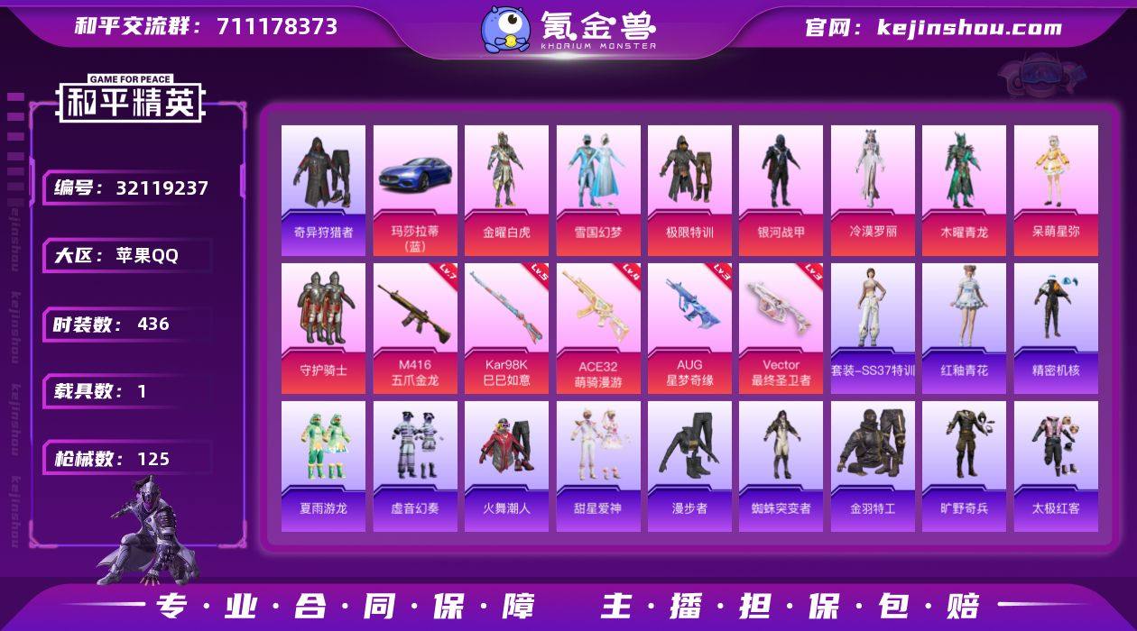 实名:可二次实名 是否支持人脸包赔:不支持 粉装数量:8 特效枪数量:5 载具数:1 时装数:436 枪械数:125 奇异狩猎者 呆萌星弥,极限特训,金曜白虎,冷漠罗丽,木曜青龙,守护骑士,雪国幻梦,银河战甲 七级M416-五爪金龙,五级Kar98K-巳巳如意,四级ACE32-萌骑漫游,三级AUG-星梦奇缘,三级Vector-最终圣卫者 玛莎拉蒂Ghibli(蓝) 红釉青花,SS37特训,雨过天青,奇异狩猎者,冰川特警,冰冻风暴,滨海假日,白色伏地魔,冰原使者,长空猛禽,传奇侦探,淡雅花蕊,风暴特警,疯狂小兔子,海岛探路者,和平特警,黑色伏地魔,灰色格斗者,幻世尖兵,黄色运动,红色运动,幻世战舞者,火舞潮人,极地朋克,惊鸿侠骨,娇憨猪猪,竞技名士,精密机核,军械专家,锦衣飞扬,金羽特工,旷野奇兵,蓝彩潮人,凛冬战士,灵公主,玲珑飞花,浪漫波比,蓝色运动,兰香蝶语,恋语绒绒,冷焰舞者,摩艾涂鸦,漫步者,魅力单车,麻辣教官,萌趣咩咩,玫纹锢梦,魔药课室,霓虹极客,柠萌假日,牛气冲天,破蛋小黄鸡,破晓战魂,青涩时光,骑行爱好者,清新柠檬,青玉碎影,日照花林,圣诞大吉,沙漠毒蛇,SS17特训,SS18特训,SS20特训,SS21特训,SS23特训,SS25特训,SS29特训,SS31特训套装,SS32特训套装,SS33特训套装,SS3特训,SS5特训,水银刺客,太极红客,甜蜜告白,特殊使命,甜星爱神,甜心亚梦,特种空勤,特战装甲,维京奇缘,小丑鱼,星谷精灵,雪山精英,雪山征服者,香桃花海,虚音幻奏,夏雨游龙,玉兔迎春,鹰眼刺客,银月精灵,夜莺强袭者,蜘蛛突变者 终晖之翼飞行器,百万伏特降落伞,极限特训降落伞,冷漠罗丽降落伞,未来战士降落伞,雪国幻梦降落伞,星梦奇缘降落伞,银河战甲降落伞,至尊龙雀降落伞,最终圣卫者降落伞