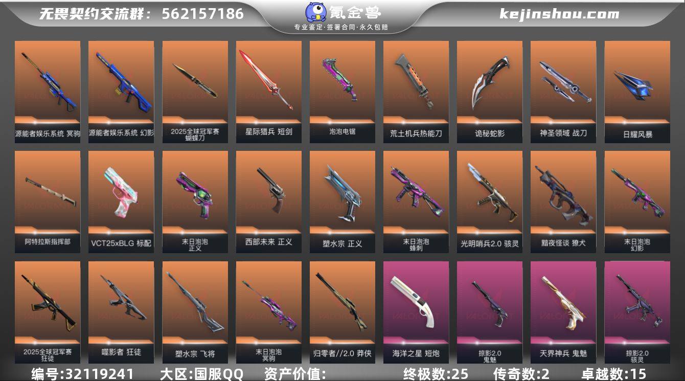 【套装】:2025全球冠军赛套装,末日泡泡套装,掠影//2.0套装 【英雄】:幻棱,炼狱,维斯,暮蝶,钛狐,壹决,铁臂,捷风,雷兹,幽影,不死鸟,贤者,猎枭,蝰蛇,零,芮娜,奇乐,尚勃勒,霓虹,斯凯,夜露,星礈,K/O,海神,盖可,黑梦,钢锁 【近战武器】:近战武器-2025全球冠军赛 蝴蝶刀,近战武器-泡泡电锯,近战武器-魔术火花,近战武器-影钩,近战武器-剥皮小刀,近战武器-黑波之刃,近战武器-荒土机兵 热能刀,近战武器-诡秘蛇影 军刀,近战武器-神圣领域 战刀,近战武器-日耀风暴 遗器,近战武器-阿特拉斯指挥部 甩棍,近战武器-星际猎兵 短剑,近战武器-魔术火花 【狂徒】:狂徒-2025全球冠军赛,狂徒-噬影者,狂徒-盖亚的复仇,狂徒-海洋之星,狂徒-紫阙金琅,狂徒-荒土机兵,狂徒-诡秘蛇影 【幻影】:幻影-末日泡泡,幻影-源能者娱乐系统,幻影-盖亚的复仇//2.0,幻影-天界神兵//2.0,幻影-侦察力量,幻影-掠影//2.0,幻影-神圣领域,幻影-纳米打击,幻影-末日之翼 【戍卫】:戍卫-天界神兵,戍卫-逆冲蛮牛,戍卫-月球哨兵,戍卫-折光棱晶 【獠犬】:獠犬-黯夜怪谈,獠犬-海洋之星//2.0,獠犬-神圣领域,獠犬-逆冲蛮牛 【冥驹】:冥驹-末日泡泡,冥驹-源能者娱乐系统,冥驹-荒土机兵,冥驹-星云暗涌 【飞将】:飞将-塑水宗,飞将-末日之翼 【莽侠】:莽侠-归零者//2.0,莽侠-诡秘蛇影,莽侠-月球哨兵 【战神】:战神-盖亚的复仇//2.0,战神-神圣领域 【奥丁】:奥丁-掠影//2.0,奥丁-纳米打击,奥丁-末日之翼 【判官】:判官-诡秘蛇影,判官-纳米打击x 【雄鹿】:雄鹿-逆冲蛮牛,雄鹿-月球哨兵 【骇灵】:骇灵-光明哨兵//2.0,骇灵-掠影//2.0,骇灵-荒土机兵,骇灵-星云暗涌 【蜂刺】:蜂刺-末日泡泡,蜂刺-星云暗涌,蜂刺-折光棱晶 【标配】:标配-荒土机兵,标配-折光棱晶 【VCT手枪】:标配-VC...
