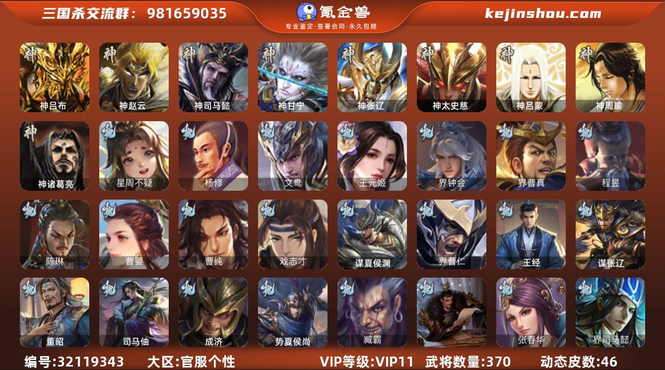【2815】官阶:大将军;VIP等级:VIP11;史诗武将数量:42;动态皮肤数量:46;武将总数:370;史诗宝珠数量:0;将魂数量:14288;神将:7;魏国史诗武将:19;蜀国史诗武将:6;吴国史诗武将:8;群史诗武将:14 神吕布,神赵云,神司马懿,神甘宁,神张辽,神太史慈,神诸葛亮,星周不疑,杨修,王元姬,界钟会,界曹真,陈琳,曹婴,曹纯,戏志才,程昱,关索,谋马超,诸葛瞻,沙摩柯,花鬘,董允,吴景,骆统,界朱然,界徐盛,贺齐,势陆郁生,文鸯,裴秀,左慈,星黄忠,麹义,南华老仙,沮授,界李儒,杜预,谋张角,谋吕布,星董卓,兀突骨,司马昭,神吕蒙,神周瑜,势夏侯尚,SP关羽,SP曹仁,SP蔡文姬,乐进,曹昂,诸葛诞,朱灵,文聘,SP姜维,张春华,钟会,曹冲,郭淮,满宠,界王异,界曹操,界司马懿,界夏侯惇,界张辽,界许褚,界郭嘉,李典,曹真,韩浩史涣,陈群,曹叡,曹休,钟繇,司马朗,王基,郭皇后,辛宪英,界甄姬,吕虔,鲁芝,蒯越蒯良,界荀彧,界徐晃,杜畿,界曹丕,界邓艾,张恭,界曹植,界满宠,界郭淮,卞夫人,华歆,蔡贞姬,袁涣,王双,崔琰,毛玠,杨阜,阮慧,曹嵩,谋徐晃,谋于禁,谋荀彧,界曹休,胡班,成济,王经,司马伷,谋张辽,谋夏侯渊,界曹仁,臧霸,董昭,势陈到,SP孙尚香,关银屏,夏侯霸,马良,关兴张苞,廖化,界马岱,关平,简雍,刘封,界法正,界关兴张苞,界刘备,界关羽,界张飞,界赵云,界马超,SP徐庶,吴懿,周仓,张松,刘谌,夏侯氏,糜竺,马忠,李严,黄皓,界诸葛亮,赵统赵广,严颜,界伊籍,界卧龙诸葛,界庞统,界孟获,界祝融,陈到,界姜维,界刘禅,吕凯,张翼,杨仪,邓芝,傅肜,费祎,糜夫人,界周仓,许靖,刘巴,彭羕,谋庞统,谋黄月英,界张嶷,谋张飞,霍峻,诸葛果,蒋琬费祎,甘夫人,鲁肃,孙茹,凌操,大乔小乔,诸葛恪,诸葛瑾,孙鲁育,程普,韩当,潘璋马忠,虞翻,朱然,界周泰,界甘宁,界吕蒙,界黄盖,界周瑜,界大乔,界陆逊,孙鲁班,朱桓,顾雍,孙休,朱治,全琮,阚泽,界孙权,界孙尚香,潘濬,严畯,界孙坚,吕岱,周妃,界孙策,...