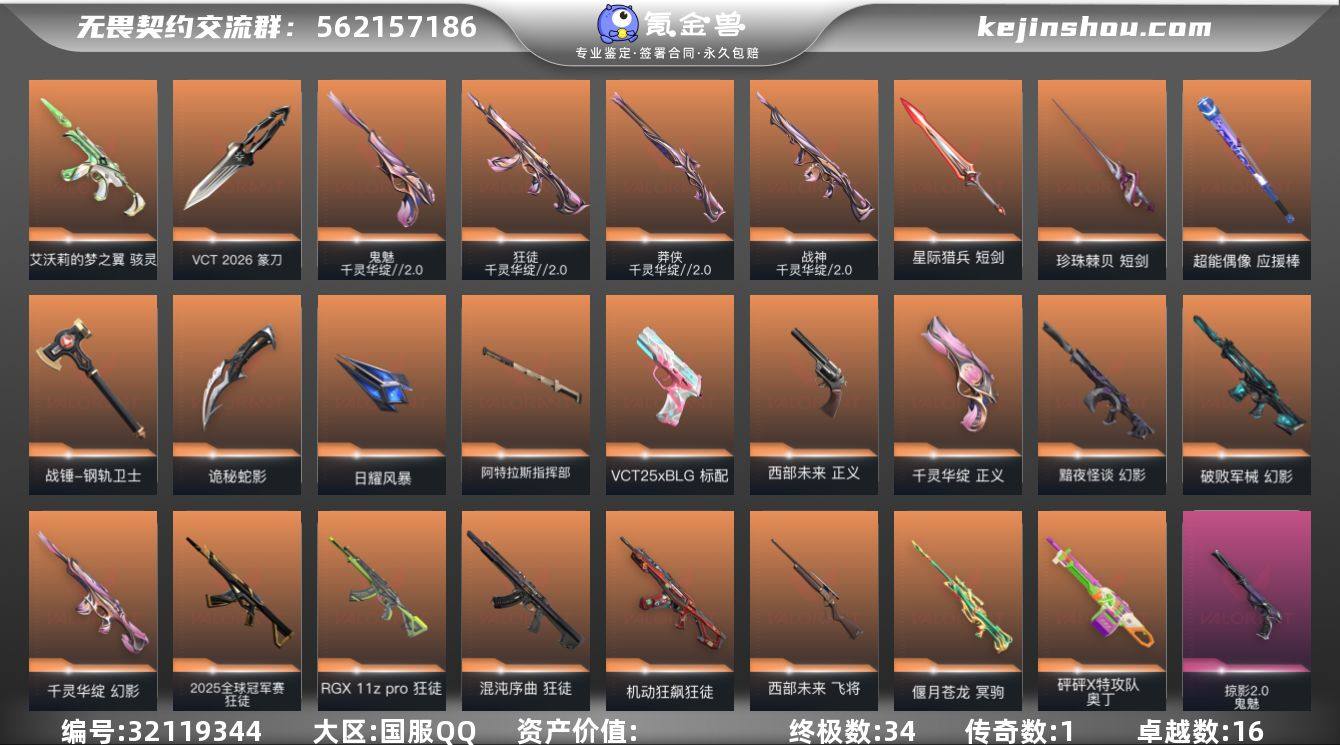 【特价出售/店主推荐】 【套装】:2024全球冠军赛套装,VCT 2025 赛季套装,西部未来套装,归零者//2.0套装,奇点//2.0套装,回火礼包:奇点套装,般若假面//2.0套装,掠影套装 【英雄】:幻棱,炼狱,维斯,暮蝶,钛狐,壹决,铁臂,捷风,雷兹,幽影,不死鸟,贤者,猎枭,蝰蛇,零,芮娜,奇乐,尚勃勒,霓虹,斯凯,夜露,星礈,K/O,海神,盖可,黑梦,钢锁 【近战武器】:近战武器-2024全球冠军赛 战刀,近战武器-奇点//2.0 蝴蝶刀,近战武器-VCT 2025 爪刀,近战武器-RGX 11z Pro//3.0 爪刀,近战武器-鬼丸国纲,近战武器-未来开拓者,近战武器-超限闪存 匕首,近战武器-荒土机兵 热能刀,近战武器-生物分子解离器,近战武器-影刃,近战武器-诡秘蛇影 军刀,近战武器-神圣领域 战刀,近战武器-日耀风暴 遗器,近战武器-阿特拉斯指挥部 甩棍 【狂徒】:狂徒-洪荒怒焰,狂徒-混沌序曲,狂徒-奇点//2.0,狂徒-创·纪元,狂徒-RGX 11z Pro,狂徒-ORA x 颗秒,狂徒-般若假面//2.0,狂徒-掠影,狂徒-盖亚的复仇,狂徒-日冕雄师,狂徒-紫阙金琅,狂徒-离子武器//2.0,狂徒-超能偶像,狂徒-荒土机兵,狂徒-诡秘蛇影 【幻影】:幻影-2024全球冠军赛,幻影-归零者//2.0,幻影-奇点,幻影-西部未来,幻影-侦察力量,幻影-超限闪存,幻影-神圣领域,幻影-纳米打击,幻影-末日之翼,幻影-西部未来 【戍卫】:戍卫-归零者//2.0,戍卫-掠影,戍卫-天界神兵,戍卫-超能偶像,戍卫-浮光跃金,戍卫-逆冲蛮牛,戍卫-月球哨兵,戍卫-折光棱晶 【獠犬】:獠犬-源能者娱乐系统,獠犬-般若假面//2.0,獠犬-神圣领域,獠犬-采蜜小蜂队,獠犬-模拟赫兹,獠犬-逆冲蛮牛 【冥驹】:冥驹-千灵华绽,冥驹-掠影,冥驹-荒土机兵,冥驹-模拟赫兹,冥驹-星云暗涌 【飞将】:飞将-黯夜怪谈,飞将-西部未来,飞将-聚合之力,飞将-末日之翼 【莽...
