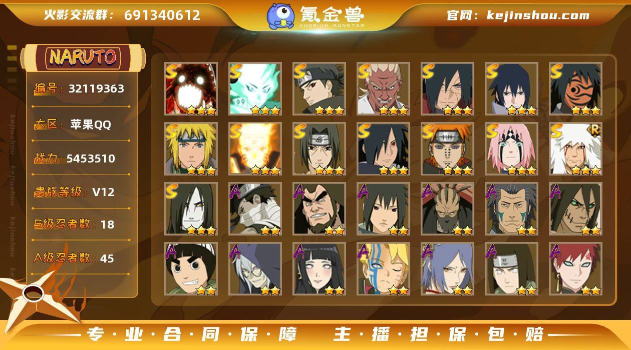 IOS/18S忍/45A忍/战力545W/V12/区服2948 (黑绝.侠佐.漂泊南.6个198A忍) 【S忍者】 宇智波佐助「漩涡鸣人」,宇智波止水「须佐能乎」,宇智波斑「五影会谈」 ,艾「忍界大战」,宇智波斑「秽土转生·解」,宇智波佐助「永恒万花筒」,神秘面具男「红夜之刃」,春野樱「忍界大战」,漩涡鸣人「九喇嘛连结」,宇智波斑「木叶创立」,自来也「舞之豪杰」,大筒木舍人「最终章」,漩涡鸣人「暴怒·第六尾」,宇智波鼬「须佐能乎」,佩恩「天道」,波风水门,大蛇丸,波风水门「九喇嘛连结」, 【A忍者】 黑绝,小南「漂泊浪客」,宇智波佐助「侠隐江湖」,药师兜「侠隐江湖」,我爱罗「新春限定」,旗木卡卡西「元气夏日」,小南「神驹佑将」,机械鸣人「初始形态」,大野木「侠隐江湖」,巳月「仙人模式」,迈特凯「青春爆炸」,长十郎「六代目水影」,不缘,日向宁次「忍界大战」,漩涡博人「桃式显现」,日向雏田「最终章」,李洛克「忍界大战」,不动,蝎「绯流琥」,宇智波泉奈,神农「羁绊」,桃地再不斩「秽土转生」,角都「秽土转生」,长门「青年」,艾「青年」,达鲁伊「五代目雷影」,宇智波佐助「须佐能乎」,旗木卡卡西「忍界大战」,漩涡鸣人「九尾查克拉」,千代「近松十人卫」,干柿鬼鲛「鲛肌融合」,秋道丁次「忍界大战」,大蛇丸「晓」,宇智波佐助「万花筒写轮眼」,飞段「死司凭血」,飞段,迪达拉,我爱罗「疾风传」,蝎,干柿鬼鲛,宇智波鼬,猿飞阿斯玛,迈特凯,桃地再不斩, PX_2491697
