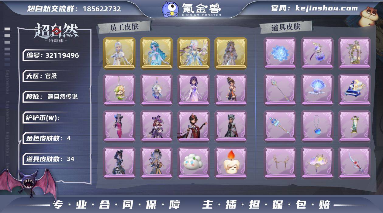 金色皮肤数量: 4 紫色皮肤数量: 8 道具皮肤数量: 34 段位: 超自然传说 员工: 逍遥,薇薇安,巫铃儿,莉莉,阿念,艾伦,小黄,零,爱丽丝,爱德华,兰,小满,临云 外观: 圣光之谕,嘻嘻头套,烈焰红唇头套,呆滞头套,卑微头套,哈士奇头套,滑稽头套,鱼头怪头套,面具马头套,萨卡班甲鱼头套,天使的呼唤,小鲨包包,天使消失的年代,钗头凤,除妖小师妹,异色序曲,精致露比头套,糖果守卫,兜风日程,樱桃奶油布丁,仙锋小姐,千夜星谕,雪墩墩头套,太空鲨头套,黎明猎手,耀眼的你,庆宴绮愿,晚安小熊,烛光纪念,瑶台梦,醉花阴,拂云仙,不朽的今夜,牛啤背包,海月息潮,剑仙,琢玉怀乡,饺饺者头套,夜浮船,孤独对望,桂冠聆诗