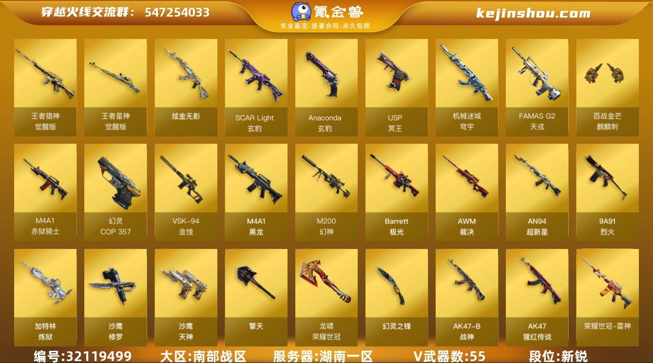 湖南一区-61V-2王者武器数-1炫金武器数 【热门武器】:M200-幻神,荣耀世冠-雷神,加特林-炼狱,COP 357-幻灵,沙鹰-修罗,荣耀世冠-龙啸*2 【王者炫金武器】:炫金无影 【音效卡】:Barrett-极光音效卡,AWM-裁决音效卡,QBZ03-天罚音效卡,死神-雪域霜狐-怀旧音效卡 【皮肤】:裁决-运输船 皮肤,星神-黯钢战甲 皮肤,M4A1-再燃火线,战神-粉色甜心皮肤,AK47-B-常胜将军-曹操,修罗-冠军之魂,龙啸-黯钢战甲 皮肤,轻型军用手斧-再燃火线 【角色】:隼,隐,玄豹,荆棘,零·纪元,雪域霜狐,云海玲珑,葵-阿尔法武装,初恋灵狐,风暴女,疾风,兰妹妹,灵狐者-X,娜塔莉娅,斯沃特-X,新娜塔莎 【人偶武器】:火麒麟-灵狐*2,异变清道夫-蛇影双骄,迷你波特博士,生化手雷-机甲核心,迷你超能女侍 【暴走生化】:超级对讲机 【挑战大师】:冰龙粉碎者-白马银枪,激光毁灭者III-白马银枪 【英雄级武器】:M4A1-黑龙*3,AN94-超新星,QBZ03-天罚,FAMAS G2-天戎,SCAR Light-玄豹*2,9A91-烈火,AK-47-猩红传说,AK47-B-战神,王者猎神-觉醒版,荣耀世冠-雷神,机械迷城-穹宇,Barrett-极光,AWM-裁决,M200-幻神,VSK-94-金蚀,王者星神-觉醒版,加特林-炼狱,沙鹰-修罗,沙鹰-天神,COP 357-幻灵,Anaconda-玄豹,USP-冥王*3,修罗-云海游龙,擎天*3,幻灵之锋,擎天-云海游龙,荣耀世冠-龙啸*2,麒麟刺-百战金芒,丛林匕首-玄豹*3,高爆手雷-幻灵,手雷-云海游龙,高爆手雷-玄豹*4,闪光弹-幻灵,闪光弹-玄豹*3,烟雾弹-幻灵,烟雾弹-玄豹*4,M4A1-赤狱骑士 【道具】:云山科技背包,炫彩背包,百战金芒炫彩背包,雪域霜狐炫彩背包,女皇终结者-魔龙之吻,救世主-黑桃战神,绿色巨人,灵魂忍者,迷雾幽灵,夺命之镰,防化服*3,金色流光-枪王排位,星辰流光-枪王排位,语音特效-怀旧,雪域霜狐表情,萌萌小葵...
