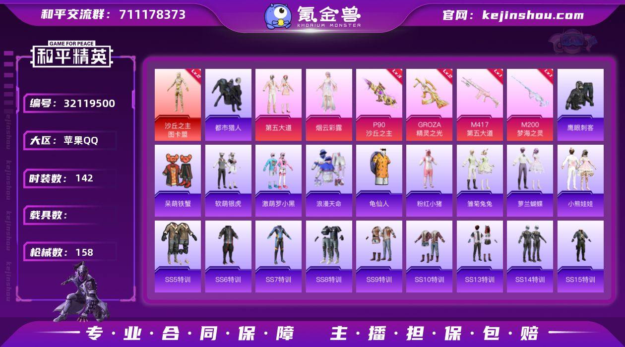 苹果 手Q-1神装-2粉装-5特效枪-0载具-5粉色飞行器-55378热力值-12王牌印记-142套装-158枪皮 【红色神装等级】:沙丘之主-图卡盟(二级) 【红色角色神装】:沙丘之主-图卡盟 【热门品类】:绝对防御上衣,套装-浪漫天命,套装-都市猎人,套装-龟仙人,套装-粉红小猪 【粉色套装】:粉装-第五大道,角色-烟云彩露 【粉色枪皮等级】:GROZA-精灵之光(二级),P90-沙丘之主(三级),Mk14-福马献瑞(三级),M417-第五大道(一级),M200-梦海之灵(一级) 【粉色枪皮】:GROZA-精灵之光,P90-沙丘之主,Mk14-福马献瑞,M417-第五大道,M200-梦海之灵 【粉色飞行器】:香车宝马飞行器,沙丘之主天马,幻海精灵飞行器,曦光华影飞行器 【粉色降落伞】:橘柚倾心降落伞,第五大道降落伞,沙丘之主降落伞,蜜语绒猫降落伞,鸢尾晶梦降落伞,星梦奇缘降落伞,精灵之光降落伞 【稀有套装】:套装-龟仙人,套装-雏菊兔兔,套装-萝兰蝴蝶,套装-小熊娃娃,套装-雨过天青,套装-红釉青花 【稀有枪皮】:AKM-夜灯,AKM-彩虹符号,AKM-影袭,AKM-破晓战魂,AKM-缤纷海域,AKM-萌趣颜团子,AKM-虎虎生威,AKM-霓虹街区,M16A4-幻世战舞者,M16A4-红色方程式,M16A4-蓝色火焰,SCAR-L-红色方程式,M416-神秘黑猫,M416-糯团青竹,M416-红色方程式,M416-绯红前夜,M416-蓝色火焰,GROZA-异彩先驱,GROZA-彩虹符号,GROZA-影袭,GROZA-春暖花开,GROZA-田园牧歌,AUG-天降萌叽,AUG-炫光贝贝,AUG-耀粉歌者,QBZ-彩虹符号,QBZ-洛神天依,M762-天降萌叽,M762-橘柚倾心,M762-瑞龙福将,M762-第五大道,M762-绯红前夜,M762-镜中幻,Mk47-天之羽翼,G36C-暗夜玫瑰,AC-VAL-天降萌叽,蜜獾-天降萌叽,UZI-啾咪啾咪,UZI-天降萌叽,UZI-影袭,UZI-炫彩节奏,UZI-红色方程式,UMP45-生命誓言,UMP45-蓝色火焰,Vector-焰鹰斗篷,Vector-夜灯,Vec...