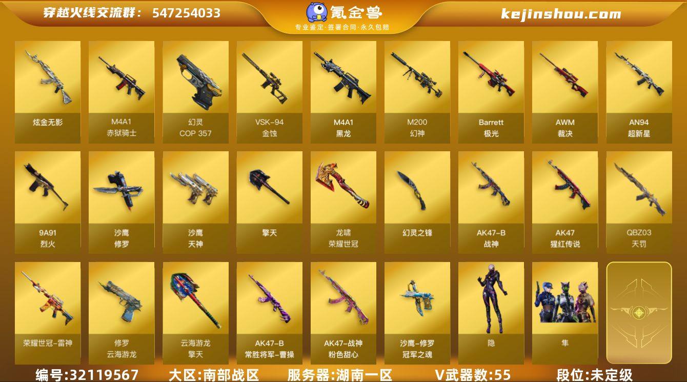 湖南一区-61V-2王者武器数-1炫金武器数 【热门武器】:M200-幻神,荣耀世冠-雷神,加特林-炼狱,COP 357-幻灵,沙鹰-修罗,荣耀世冠-龙啸*2 【王者炫金武器】:炫金无影 【音效卡】:Barrett-极光音效卡,AWM-裁决音效卡,QBZ03-天罚音效卡,死神-雪域霜狐-怀旧音效卡 【皮肤】:裁决-运输船 皮肤,星神-黯钢战甲 皮肤,M4A1-再燃火线,战神-粉色甜心皮肤,AK47-B-常胜将军-曹操,修罗-冠军之魂,龙啸-黯钢战甲 皮肤,轻型军用手斧-再燃火线 【角色】:隼,隐,玄豹,荆棘,零·纪元,雪域霜狐,云海玲珑,葵-阿尔法武装,初恋灵狐,风暴女,疾风,兰妹妹,灵狐者-X,娜塔莉娅,斯沃特-X,新娜塔莎 【人偶武器】:火麒麟-灵狐*2,异变清道夫-蛇影双骄,迷你波特博士,生化手雷-机甲核心,迷你超能女侍 【暴走生化】:超级对讲机 【挑战大师】:冰龙粉碎者-白马银枪,激光毁灭者III-白马银枪 【英雄级武器】:M4A1-黑龙*3,AN94-超新星,QBZ03-天罚,FAMAS G2-天戎,SCAR Light-玄豹*2,9A91-烈火,AK-47-猩红传说,AK47-B-战神,王者猎神-觉醒版,荣耀世冠-雷神,机械迷城-穹宇,Barrett-极光,AWM-裁决,M200-幻神,VSK-94-金蚀,王者星神-觉醒版,加特林-炼狱,沙鹰-修罗,沙鹰-天神,COP 357-幻灵,Anaconda-玄豹,USP-冥王*3,修罗-云海游龙,擎天*3,幻灵之锋,擎天-云海游龙,荣耀世冠-龙啸*2,麒麟刺-百战金芒,丛林匕首-玄豹*3,高爆手雷-幻灵,手雷-云海游龙,高爆手雷-玄豹*4,闪光弹-幻灵,闪光弹-玄豹*3,烟雾弹-幻灵,烟雾弹-玄豹*4,M4A1-赤狱骑士 【道具】:云山科技背包,炫彩背包,百战金芒炫彩背包,雪域霜狐炫彩背包,女皇终结者-魔龙之吻,救世主-黑桃战神,绿色巨人,灵魂忍者,迷雾幽灵,夺命之镰,防化服*3,金色流光-枪王排位,星辰流光-枪王排位,语音特效-怀旧,雪域霜狐表情,萌萌小葵...