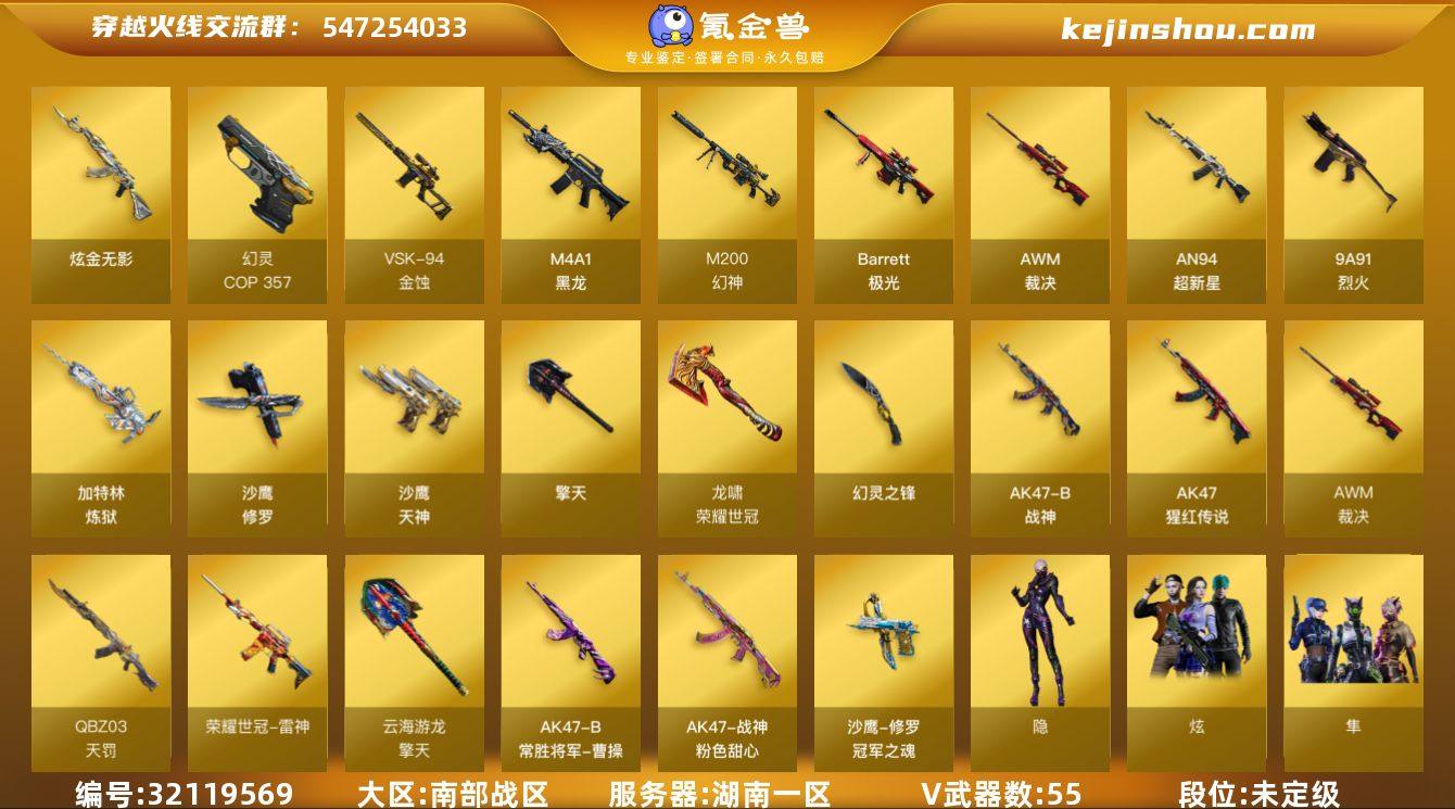 湖南一区-61V-2王者武器数-1炫金武器数 【热门武器】:M200-幻神,荣耀世冠-雷神,加特林-炼狱,COP 357-幻灵,沙鹰-修罗,荣耀世冠-龙啸*2 【王者炫金武器】:炫金无影 【音效卡】:Barrett-极光音效卡,AWM-裁决音效卡,QBZ03-天罚音效卡,死神-雪域霜狐-怀旧音效卡 【皮肤】:裁决-运输船 皮肤,星神-黯钢战甲 皮肤,M4A1-再燃火线,战神-粉色甜心皮肤,AK47-B-常胜将军-曹操,修罗-冠军之魂,龙啸-黯钢战甲 皮肤,轻型军用手斧-再燃火线 【角色】:隼,隐,玄豹,荆棘,零·纪元,雪域霜狐,云海玲珑,葵-阿尔法武装,初恋灵狐,风暴女,疾风,兰妹妹,灵狐者-X,娜塔莉娅,斯沃特-X,新娜塔莎 【人偶武器】:火麒麟-灵狐*2,异变清道夫-蛇影双骄,迷你波特博士,生化手雷-机甲核心,迷你超能女侍 【暴走生化】:超级对讲机 【挑战大师】:冰龙粉碎者-白马银枪,激光毁灭者III-白马银枪 【英雄级武器】:M4A1-黑龙*3,AN94-超新星,QBZ03-天罚,FAMAS G2-天戎,SCAR Light-玄豹*2,9A91-烈火,AK-47-猩红传说,AK47-B-战神,王者猎神-觉醒版,荣耀世冠-雷神,机械迷城-穹宇,Barrett-极光,AWM-裁决,M200-幻神,VSK-94-金蚀,王者星神-觉醒版,加特林-炼狱,沙鹰-修罗,沙鹰-天神,COP 357-幻灵,Anaconda-玄豹,USP-冥王*3,修罗-云海游龙,擎天*3,幻灵之锋,擎天-云海游龙,荣耀世冠-龙啸*2,麒麟刺-百战金芒,丛林匕首-玄豹*3,高爆手雷-幻灵,手雷-云海游龙,高爆手雷-玄豹*4,闪光弹-幻灵,闪光弹-玄豹*3,烟雾弹-幻灵,烟雾弹-玄豹*4,M4A1-赤狱骑士 【道具】:云山科技背包,炫彩背包,百战金芒炫彩背包,雪域霜狐炫彩背包,女皇终结者-魔龙之吻,救世主-黑桃战神,绿色巨人,灵魂忍者,迷雾幽灵,夺命之镰,防化服*3,金色流光-枪王排位,星辰流光-枪王排位,语音特效-怀旧,雪域霜狐表情,萌萌小葵...