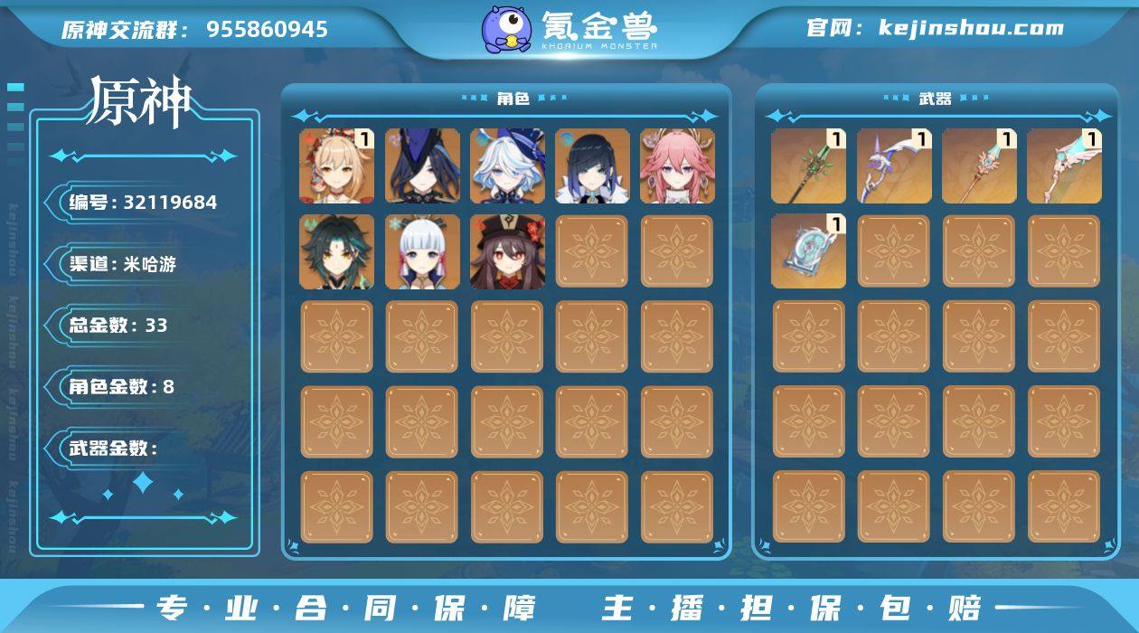 33黄 风元素:0命魈, 0命温迪 火元素:0命胡桃, 1命宵宫, 0命玛薇卡 水元素:0命哥伦比娅, 0命芙宁娜, 0命夜兰, 0命珊瑚宫心海 雷元素:0命克洛琳德, 0命八重神子, 0命雷电将军 冰元素:0命神里绫华 【常驻五星角色及命座】 风元素:0命琴 火元素:1命迪卢克 水元素:1命莫娜 冰元素:0命七七 草元素:5命提纳里 单手剑:精1圣显之钥 长柄武器:精1和璞鸢, 精1天空之脊, 精1赤沙之杖 法器:精1天空之卷 弓:精1天空之翼, 精1阿莫斯之弓 【角色皮肤】 四星角色:丽莎-叶隐芳名, 凯亚-帆影游风, 行秋-雨化竹身, 菲谢尔-极夜真梦