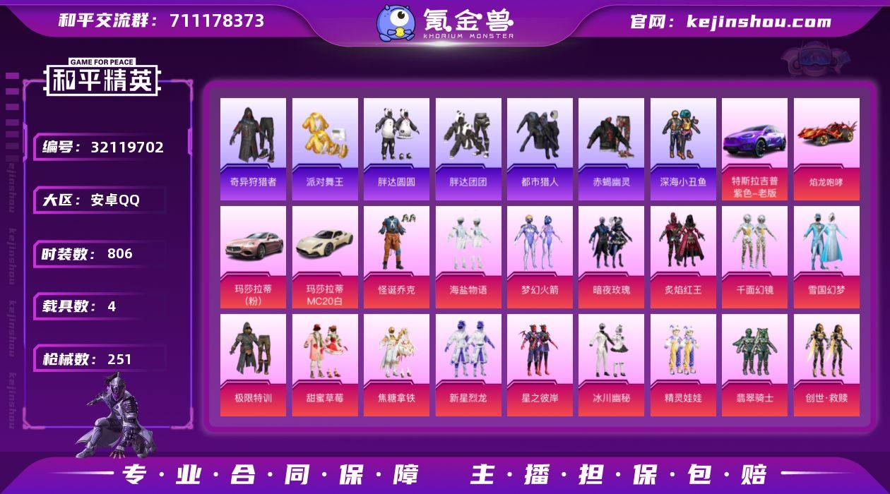 实名:可二次实名 是否支持人脸包赔:支持 粉装数量:30 特效枪数量:10 载具数:4 时装数:806 枪械数:251 奇异狩猎者,赤蝎幽灵,都市猎人,胖达团团,派对舞王,胖达圆圆,深海小丑鱼 暗夜玫瑰,宝贝奶油派,冰川粉黛,冰川红玫,冰川幽秘,缤纷油彩,创世·救赎,炙焰红王,翡翠骑士,放客神游,粉色回忆,怪诞乔克,酣梦娃娃,海盐物语,精灵娃娃,焦糖拿铁,极限特训,金曜白虎,极致幻想,梦幻火箭,千面幻镜,山涧鹿灵,天使彩虹糖,甜蜜草莓,甜蜜誓约,童趣迷兔,甜心巧克力,雪国幻梦,新星烈龙,星之彼岸 七级M416-心之恋语,六级M416-五爪金龙,六级M762-甜蜜誓约,五级DP-28-豹影疾电,五级AKM-炫紫旋律,五级Kar98K-巳巳如意,五级SCAR-L-青春物语,五级UZI-绮梦青鸾,四级Kar98K-伏魔团,四级SLR-暗夜玫瑰 特斯拉Model X(奇幻紫),玛莎拉蒂Ghibli(粉),玛莎拉蒂MC20(星石白),焰龙咆哮 狙击之神,SS37特训,青翼流星,雪国风尚,SS36特训,奇异狩猎者,炫彩糖果,SS35特训,元气之梦,狂鲨锋刃,SS34特训套装,安第斯皇冠,暗黑裁决,Alan Walker,暗影哥特,暗夜傀儡,暗夜魅影,暗夜契约,暗夜之虎,冰川特警,冰冻风暴,缤纷果语,北国孤狼,滨海厨神,冰河战士,冰原使者,爆竹金鼠,纯白誓言,长空猛禽,丛林猎人,潮流游乐家,潮萌小黄鸭,传奇侦探,创世·追猎,晨曦薄雾,赤蝎幽灵,炽焰拳师,纯真浪花,顶瓜瓜,大橘为重,呆萌铁蟹,都市丽猫,都市猎人,飞驰魅影,绯格组合,风华少年志,疯狂小兔子,粉甜马卡龙,福星高照,飞行日记,格斗先锋,格斗专家,光之冒险,贵族骑装,好奇恐龙,黑色刀锋,灰色格斗者,海上生明月,幻世战舞者,红熊茄茄,幻影武者,酒红色名流,娇憨猪猪,竞技名士,竞技勇士朋克,激萌罗小黑,精神漫游,金鼠迎春,街头潮人,街头风暴,街舞达人,机械英豪,机械征服者,金耀舞者,空岛之星,快乐星愿,狂沙舞者,狂战萌兔,蓝调潮人,龙的传人,凛冬战士,浪漫波比,浪漫天命,蓝色守护者,恋语绒绒,漫步者,梦幻奶油,魅力单车,麻辣教官,梦起落英,萌趣咩咩,萌趣颜团子,迷域探索者,弄潮海豚,逆风勇士,霓虹极客,霓虹街区,怒火燎原,霓虹热舞,牛气冲天,牛气满满,奶油香芋,胖达团团,派对舞王,胖达圆圆,青春冒险家,轻风白浪,拳皇97八神庵,青龙圣者,千禧之恋,青羽突袭者,热情海星,热血青春,人鱼之吻,圣诞大吉,深海小丑鱼,深蓝冒险家,神秘领域,SS10特训,SS11特训,SS12特训,SS15特训,SS18特训,SS19特训,SS20特训,SS21特训,SS22特训,SS25特训,SS30特训套装,SS31特训套装,SS32特训套装,SS33特训套装,SS5特训,SS6特训,SS7特训,SS8特训,SS9特训,巳巳如意,时尚圣诞,酸甜橘柚,探宝勇士,太极红客,甜蜜告白,甜蜜熊情侣,兔兔白日梦,甜心亚梦,团圆交子,田园牧歌,特战装甲,维京奇缘,王牌教练,万圣娃娃,小丑鱼,迅捷狂鲨,炫蓝之夏,旭日情侣,夏日音浪,雪山精英,雪山征服者,核芯基因,虚音幻奏,迎春赐吉,原初圣火,异彩先驱,跃动心情,摇滚狂鲨,一箭钟情,云丝凤蟒,音速流光,樱桃黑巧,玉兔迎春,野性山猫,鹰眼刺客,鱼渊荷华,燕燕于飞,异域银装,智慧之神,折纸暴龙 炫彩糖果飞行器,繁花小夜曲飞行翼,天之羽翼飞行器,炫彩糖果降落伞,暗夜玫瑰降落伞,彩虹甜喵降落伞,繁花小夜曲降落伞,伏魔团降落伞,歌者泠鸢降落伞,精灵梦叶罗丽降落伞,恐龙拽拽降落伞,梦幻火箭降落伞,马卡龙降