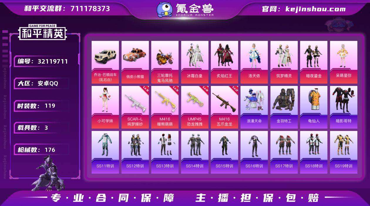 安卓 手Q-7粉装-4特效枪-3载具-1粉色飞行器-58746热力值-10王牌印记-119套装-176枪皮 【热门品类】:套装-浪漫天命,套装-金羽特工,套装-龟仙人,套装-暗影哥特 【粉色套装】:粉装-冰霜白皇,粉装-炙焰红王,角色-洛天依,粉装-筑梦精灵,粉装-暗夜鎏金,角色-呆萌星弥,角色-小可学妹 【粉色枪皮等级】:SCAR-L-纯梦嫁纱(五级),M416-五爪金龙(二级),M416-暖熊萌萌(五级),UMP45-恐龙拽拽(四级) 【粉色载具】:乔治巴顿战车(乳石白),俏皮小熊猫,鬼马风驰 【粉色枪皮】:SCAR-L-纯梦嫁纱,M416-五爪金龙,M416-暖熊萌萌,UMP45-恐龙拽拽 【粉色飞行器】:天之羽翼飞行器 【粉色降落伞】:童趣迷兔降落伞,香水柠檬降落伞,王牌四分卫降落伞,洛神天依降落伞,恐龙拽拽降落伞,筑梦精灵降落伞,旋转彩虹降落伞,飒粉甜心降落伞,白勺歌姬降落伞,未来歌姬降落伞 【稀有套装】:套装-龟仙人 【稀有枪皮】:AKM-夜灯,AKM-彩虹符号,AKM-影袭,AKM-恐龙拽拽,AKM-灼热熔岩,AKM-生命誓言,AKM-破晓战魂,AKM-萌趣颜团子,AKM-虎虎生威,AKM-锦绣火鲤,AKM-霓虹街区,AKM-龙的传人,M16A4-幻世战舞者,M16A4-甜心亚梦,M16A4-红色方程式,M16A4-蓝色火焰,SCAR-L-炫彩节奏,SCAR-L-玉兔迎春,SCAR-L-红色方程式,M416-糯团青竹,M416-红色方程式,M416-蓝色火焰,GROZA-异彩先驱,GROZA-彩虹符号,GROZA-懵萌河马,GROZA-林间仙鹿,GROZA-田园牧歌,AUG-天降萌叽,AUG-耀粉歌者,AUG-青春冒险家,QBZ-彩虹符号,QBZ-洛神天依,QBZ-飞驰魅影,M762-天降萌叽,M762-彩虹甜喵,M762-彩虹符号,M762-牛气冲天,M762-瑞龙福将,M762-第五大道,M762-绯红前夜,Mk47-妙红点点,Mk47-洛神天依,Mk47-青春冒险家,G36C-懵萌河马,G36C-时空追击者,AC-VAL-天降萌叽,AC-VAL-彩虹甜喵,AC-VAL-甜心亚梦,AC-VAL-闲梦青缨...