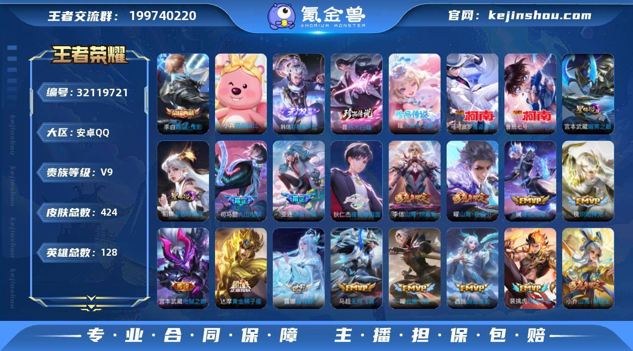 ·鸣剑曳影·九霄神辉·无相·韩信群星魔术团·朽木白哉·大耳狗之梦·江户川柯南·怪盗基德·夜礼服假面·武圣·祈雪灵祝·永曜之星·天机无算天幕·可二次】w18152-安卓Q-128英雄-424皮肤-10王者印记-187铭文-贵族积分12w【贵族9】【2典藏·1珍品无双·2无双·4珍品·2星传说·37传说·2天幕·25按键·幸运值123】【因赛季更新游戏段付以上号为准!】 【英雄全皮】:刘禅全皮,司马懿全皮,露娜全皮,孙权全皮,苍全皮,敖隐全皮,蒙恬全皮,暃全皮,空空儿全皮,影全皮 【荣耀典藏】:李白鸣剑曳影,花木兰九霄神辉 【珍品无双】:貂蝉馥梦繁花 【无双皮肤】:孙悟空无相,韩信群星魔术团 【珍品传说】:暃朽木白哉,瑶大耳狗之梦,鲁班七号江户川柯南,马可波罗怪盗基德 【星元皮肤】:貂蝉金色仲夏夜,宫本武藏幽冥之眼 【天幕】:共赏芳华天幕,天机无算天幕 【传说皮肤】:马超神骥逐星野,元歌诡秘之主,大司命死亡执政官,司马懿九山相柳,澜愿照九州拓,裴擒虎祥瑞亨通,王昭君映山客,桑启鸣野蒿,庄周牧神诗旅,亚连落雪白狼,貂蝉曦玄引,澜逐花归海,露娜霜月吟,狄仁杰夜礼服假面,东皇太一灼幽烈阳,花木兰燃星之曲,小乔山海琳琅生,曜山海苍雷引,李信山海炽霜斩,王昭君星穹之声,百里守约碎云,马超无双飞将,露娜启示之音,西施游龙清影,李元芳飞鸢探春,公孙离祈雪灵祝,镜炽阳神光,虞姬启明星使,关羽武圣,曜云鹰飞将,张良黄金白羊座,干将莫邪久胜战神,达摩黄金狮子座,后羿黄金射手座,杨戬永曜之星,貂蝉仲夏夜之梦,宫本武藏地狱之眼 【限定皮肤】:暃埋骨钱,蒙犽顽岩魄,蔡文姬夏日便利店,大乔绒语心约,虞姬夏日便利店,姜子牙天穹之誓,杨戬破阵退雄兵,李白谪仙醉月,狄仁杰阴阳师,小乔山海琳琅生,赵云皇家上将,赵云龙胆,墨子神迹守卫,妲己热情桑巴,孙尚香蔷薇恋人,庄周高山流水,高渐离死...