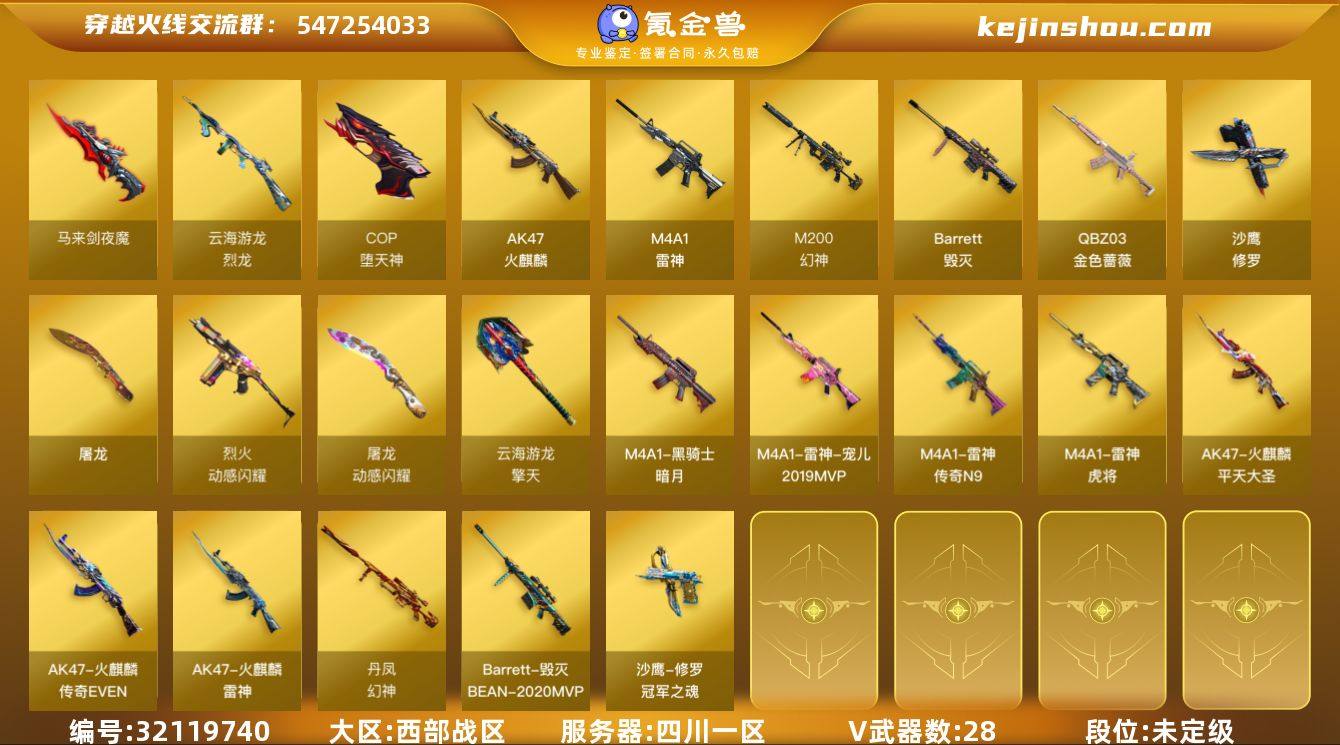 四川一区-32V-3王者武器数-0炫金武器数 【热门武器】:QBZ03-金色蔷薇,M200-幻神,COP-堕天神,沙鹰-修罗 【皮肤】:幻神-丹凤,幻神-宠儿-2021MVP,雷神-荣耀之魄,雷神-虎将,雷神-传奇N9,雷神-宠儿-2019MVP,火麒麟-雷神,AK47-火麒麟-传奇EVEN,火麒麟-平天大圣,毁灭-BEAN-2020MVP,黑骑士-暗月*2,修罗-冠军之魂 【角色】:零·纪元,奇洋探员,乔伊教练,云海玲珑,暗夜-X,初恋灵狐,娟娟,兰-新年限定,灵狐者-X,灵狐者-黄金海岸,潘多拉-甜心教官,青霞仙子,莎莎,斯沃特-X 【人偶武器】:斯泰尔-枪娘暗刃,夺魂 【暴走生化】:超级对讲机 【挑战大师】:冰龙粉碎者-白马银枪,激光毁灭者III-白马银枪,VEPR-12-金魔,激光毁灭者III 【英雄级武器】:AK47-火麒麟,M4A1-雷神*2,QBZ03-金色蔷薇,烈火-动感闪耀,王者芳薇-觉醒版,机械迷城-穹宇,Barrett-毁灭,M200-幻神,王者星神-觉醒版,炼狱-悦蓝-觉醒版,烈龙-云海游龙,沙鹰-修罗,COP-堕天神,天神-动感闪耀,屠龙,马来剑-夜魔,屠龙-动感闪耀,擎天-云海游龙,高爆手雷-夜魔*3,手雷-动感闪耀,手雷-云海游龙,闪光弹-夜魔*3,烟雾弹-夜魔*3 【道具】:WE炫彩背包,云山科技背包,云海游龙炫彩背包,全能枪王背包,虎牙炫彩背包,哔哩哔哩名片,女皇终结者-魔龙之吻,救世主-黑桃战神,绿色巨人,灵魂忍者,迷雾幽灵,夺命之镰,防化服*3,金色流光-枪王排位*2,星辰流光-枪王排位,枪王排位28赛季金色流光,热带奇洋打击特效,动感闪耀表情,云海游龙表情,EP战队名片,防弹头盔*7,防弹衣*7,C4工具钳*7,手雷包*7 【特殊枪械】: