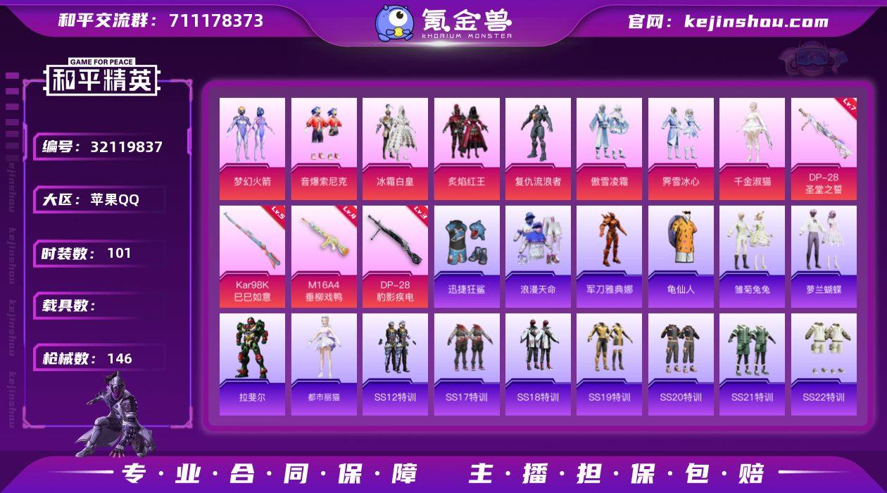 苹果 手Q-8粉装-4特效枪-0载具-1粉色飞行器-46503热力值-10王牌印记-101套装-146枪皮 【热门品类】:粉装-梦幻火箭,粉装-音爆索尼克,套装-浪漫天命,角色-军刀雅典娜,套装-龟仙人 【粉色套装】:粉装-梦幻火箭,粉装-冰霜白皇,粉装-炙焰红王,角色-复仇流浪者,粉装-傲雪凌霜,粉装-霁雪冰心,粉装-音爆索尼克,角色-千金淑猫 【粉色枪皮等级】:M16A4-垂柳戏鸭(四级),Kar98K-巳巳如意(五级),DP-28-圣堂之誓(七级),DP-28-豹影疾电(三级) 【粉色枪皮】:M16A4-垂柳戏鸭,Kar98K-巳巳如意,DP-28-圣堂之誓,DP-28-豹影疾电 【粉色飞行器】:闪光银龙飞行器 【粉色降落伞】:甜心宝贝降落伞,梦幻火箭降落伞,炙焰牛王降落伞,环太平洋降落伞,绒雪飘舞降落伞,垂柳戏鸭降落伞,太空嘟嘟降落伞,飒粉甜心降落伞,未来歌姬降落伞,莲影清波降落伞,创世·救赎降落伞,千金淑猫降落伞,幻彩电音降落伞 【稀有套装】:套装-龟仙人,套装-雏菊兔兔,套装-萝兰蝴蝶,角色-拉斐尔,角色-都市丽猫 【稀有枪皮】:AKM-彩虹符号,AKM-星之彼岸,AKM-环太平洋,AKM-缤纷海域,AKM-虎虎生威,AKM-龙的传人,M16A4-幻世战舞者,M16A4-甜心亚梦,M16A4-蓝色火焰,SCAR-L-炫彩节奏,SCAR-L-玉兔迎春,SCAR-L-甜蜜誓约,SCAR-L-红色方程式,M416-糯团青竹,M416-蓝色火焰,GROZA-异彩先驱,AUG-天降萌叽,AUG-耀粉歌者,AUG-闲梦青缨,QBZ-彩虹符号,QBZ-未来歌姬,QBZ-飞驰魅影,M762-天星战神,M762-天降萌叽,M762-奇异狩猎者,M762-牛气冲天,M762-甜心宝贝,M762-第五大道,M762-绒雪飘舞,Mk47-炫光之旅,AC-VAL-天降萌叽,AC-VAL-彩虹甜喵,AC-VAL-甜心亚梦,AC-VAL-闲梦青缨,蜜獾-垂柳戏鸭,蜜獾-天降萌叽,蜜獾-娇憨猪猪,UZI-天降萌叽,UZI-娇憨猪猪,UZI-炫彩节奏,UMP45-涂山之恋,UMP45-炫光之旅,UMP45-生命誓...
