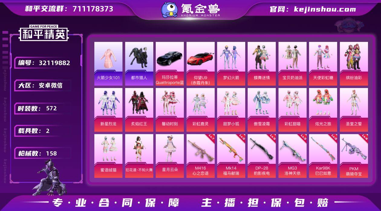可二次实名【公主女号2红装AUG星梦奇缘小丑女都市猎人7载具15粉装16特效枪 秒换绑不用等】 安卓Q区-105839热力值-217套装-300枪皮 【2红装】 镜域双华-欧若拉(2级) 暮色玫影-艾丽娅(1级)【7载具】 兰博SUV黄色 兰博SVJ绿色 杜卡迪 Panigale V4(杜卡迪红) Formula E Gen2(巅峰兰) 萌兔起飞僚机 星梦玉骢 冰绡玉鳞【3稀有】 都市猎人 Mark.06蓝螳螂 8号机粉螳螂【15粉装】 狂魅哈莉(小丑女) 梦幻火箭 蜜语绒猫 星之彼岸 绝对恒星 猩猩队长 宙之时溯 莲影清波 星云暗核 银瓶流水 角色-冷漠罗丽 角色-罗征 角色-萨利娅 角色-奇迹舞步 美琪 神隐金牛【16特效枪】 AUG-星梦奇缘(3级) M24-镜域双华(3级) AKM-幽焰骑士(3级) P90-沙丘之主(3级) M416-暖熊萌萌(7级) AKS-74U-森灵之息(5级) Mk14-福马献瑞(5级) UMP45-萌骑冒险(3级) SCAR-L-锦绣绵绵(5级) MG3-酷泡奶龙(7级) Kar98K-巳巳如意(5级) Mk14-甜梦熊击(5级) AUG-暖羊咩咩(5级) GROZA-镜光银凌(5级) DP-28-豹影疾电(5级) MG-36-沧焰双生(5级)【326热门】 浪漫天命 雪山精英(老6服) 鹰眼刺客 破蛋小黄鸡 小丑鱼 深海小丑鱼 暗影哥特(红眼罩) 狂沙舞者 M762-风花雪月 白色伏地魔 SS27特训 SS26特训 SS25特训 SS24特训 SS23特训 SS22特训 Mk14-纯梦嫁纱 Mini14-梦幻火箭 M762-暖熊萌萌 AKM-缤纷海域 AKM-环太平洋 SCAR-L-玉兔迎春 GROZA-田园牧歌 AUG-幻影战神 M762-天降萌叽 Mk47-乌木金纹 UMP45-蓝色火焰 UMP45-炫光之旅 DBS-彩虹符号 M249-彩虹符号 AKM-星之彼岸 M416-蓝色火焰 长空猛禽 弄潮海豚 夏日倾情 甜蜜熊情侣 特训学院 青涩时光 青年教官 霓虹街区 懵萌河马 魅力单车 蓝色运动 竞技达人朋克