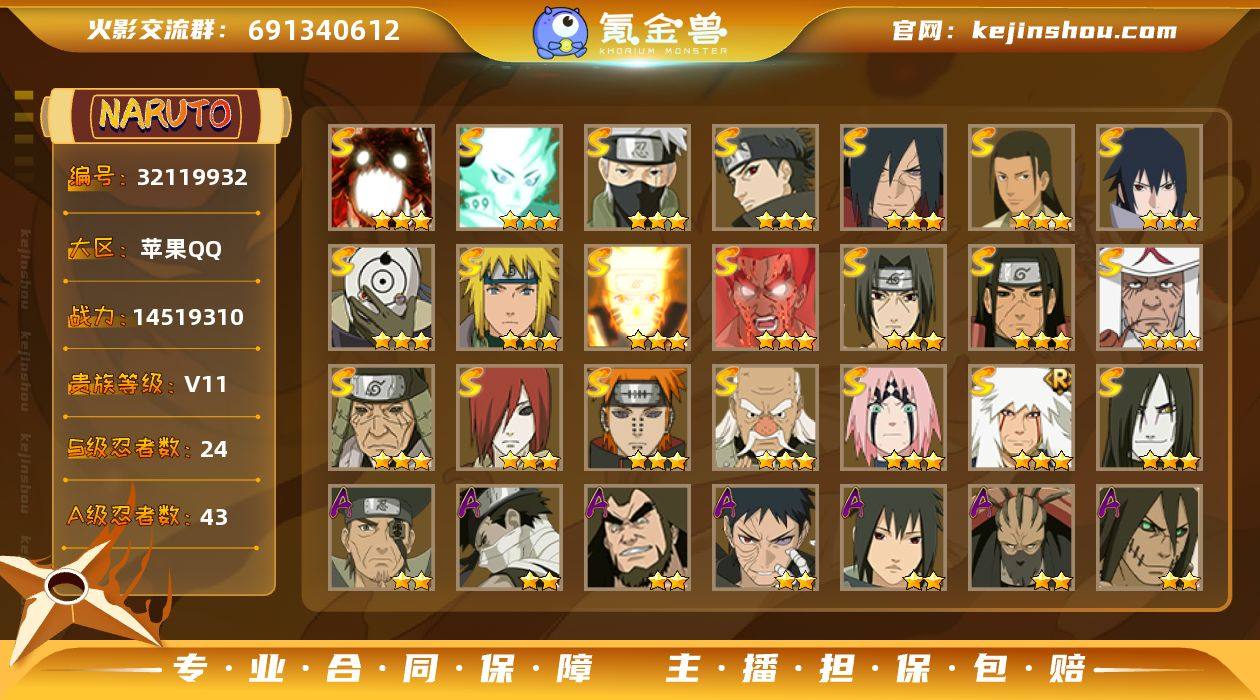 IOS/24S忍/43A忍/战力1451W/V11/区服605 【S忍者】 宇智波佐助「漩涡鸣人」,宇智波止水「须佐能乎」,宇智波斑「五影会谈」 ,宇智波斑「秽土转生·解」,千手柱间「木叶创立」,宇智波佐助「永恒万花筒」,春野樱「忍界大战」,漩涡鸣人「九喇嘛连结」,大野木「忍界大战」,迈特凯「死门」,千手柱间「秽土转生」,自来也「舞之豪杰」,旗木卡卡西「须佐能乎」,大筒木舍人「最终章」,漩涡鸣人「暴怒·第六尾」,宇智波斑「白面具」,猿飞日斩「秽土转生」,长门「秽土转生」,宇智波鼬「须佐能乎」,佩恩「天道」,猿飞日斩,波风水门,大蛇丸,波风水门「九喇嘛连结」, 【A忍者】 猿飞阿斯玛「神驹佑将」,旗木卡卡西「神威对决」,机械鸣人「初始形态」,大野木「侠隐江湖」,纲手「妖怪奇谭」,巳月「仙人模式」,迈特凯「青春爆炸」,宇智波佐助「侠隐江湖」,土台「忍界大战」,长十郎「六代目水影」,不缘,日向宁次「忍界大战」,漩涡博人「桃式显现」,日向雏田「最终章」,小南「漂泊浪客」,李洛克「忍界大战」,蝎「绯流琥」,宇智波泉奈,宇智波带土「漂泊浪客」,神农「羁绊」,桃地再不斩「秽土转生」,角都「秽土转生」,宇智波止水,长门「青年」,艾「青年」,波风水门「青年」,宇智波佐助「须佐能乎」,千代「近松十人卫」,秋道丁次「忍界大战」,猿飞阿斯玛「秽土转生」,宇智波佐助「万花筒写轮眼」,奇拉比,漩涡鸣人「仙人模式」,飞段「死司凭血」,小南,飞段,我爱罗「疾风传」,蝎,干柿鬼鲛,宇智波鼬,猿飞阿斯玛,迈特凯,桃地再不斩, PX_2490255