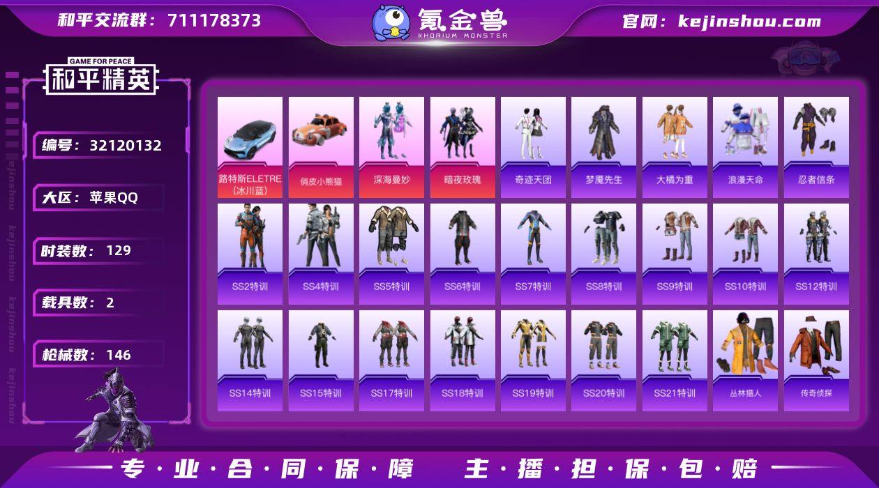 苹果 手Q-2粉装-0特效枪-2载具-0粉色飞行器-44078热力值-1王牌印记-129套装-146枪皮 【热门品类】:套装-浪漫天命,套装-忍者信条 【粉色套装】:粉装-深海曼妙,粉装-暗夜玫瑰 【粉色载具】:路特斯ELETRE(冰川蓝),俏皮小熊猫 【粉色降落伞】:凝视深渊降落伞,至尊龙雀降落伞,春暖花开降落伞,神秘黑猫降落伞,古堡领主降落伞,银刃赛罗降落伞,王牌四分卫降落伞,炙焰牛王降落伞 【稀有枪皮】:AKM-PEL轰鸣竞梦者,AKM-冰凉西瓜,AKM-四圣焕新,AKM-天启纪元,AKM-彩虹符号,AKM-生命誓言,AKM-霓虹街区,M16A4-夜灯,M16A4-机械英豪,M16A4-甜心亚梦,M16A4-红色方程式,M16A4-蓝色火焰,SCAR-L-红色方程式,SCAR-L-金风玉露,SCAR-L-雷霆特警,SCAR-L-青丘仙客,M416-仓鼠灰灰,M416-夜灯,M416-红色方程式,M416-蓝色火焰,GROZA-彩虹符号,GROZA-春暖花开,GROZA-治愈之星,GROZA-雷霆特警,GROZA-黑色刀锋,AUG-耀粉歌者,QBZ-神秘黑猫,QBZ-诡娃娃,QBZ-赛罗,QBZ-飞驰魅影,M762-拳皇97,M762-暖熊萌萌,M762-牛气冲天,M762-诡娃娃,G36C-不夜海上花,G36C-青丘仙客,AC-VAL-天降萌叽,AC-VAL-甜心亚梦,UZI-众神之王,UZI-幻影战神,UZI-金风玉露,UZI-魔法学院,UMP45-夜灯,UMP45-生命誓言,UMP45-粉色回忆,UMP45-蓝色火焰,UMP45-诡娃娃,UMP45-金玉无双,Vector-彩虹符号,Vector-治愈之星,Vector-生命誓言,Vector-香水柠檬,Vector-黑色刀锋,汤姆逊-勇闯险境,汤姆逊-耀粉歌者,野牛-机械英豪,MP5K-众神之王,P90-飞驰魅影,Kar98K-勇闯险境,Kar98K-古堡领主,Kar98K-彩虹符号,Kar98K-梦幻火箭,Kar98K-狮舞迎春,Kar98K-王子的夏天,Kar98K-飞驰魅影,M24-治愈之星,M24-众神之王,M24-冰封烈焰,AWM-不夜海上花,AWM-荒野猎神,SKS-勇闯险境,SKS-夜灯,SKS-诡娃娃,SKS-青丘仙客,...