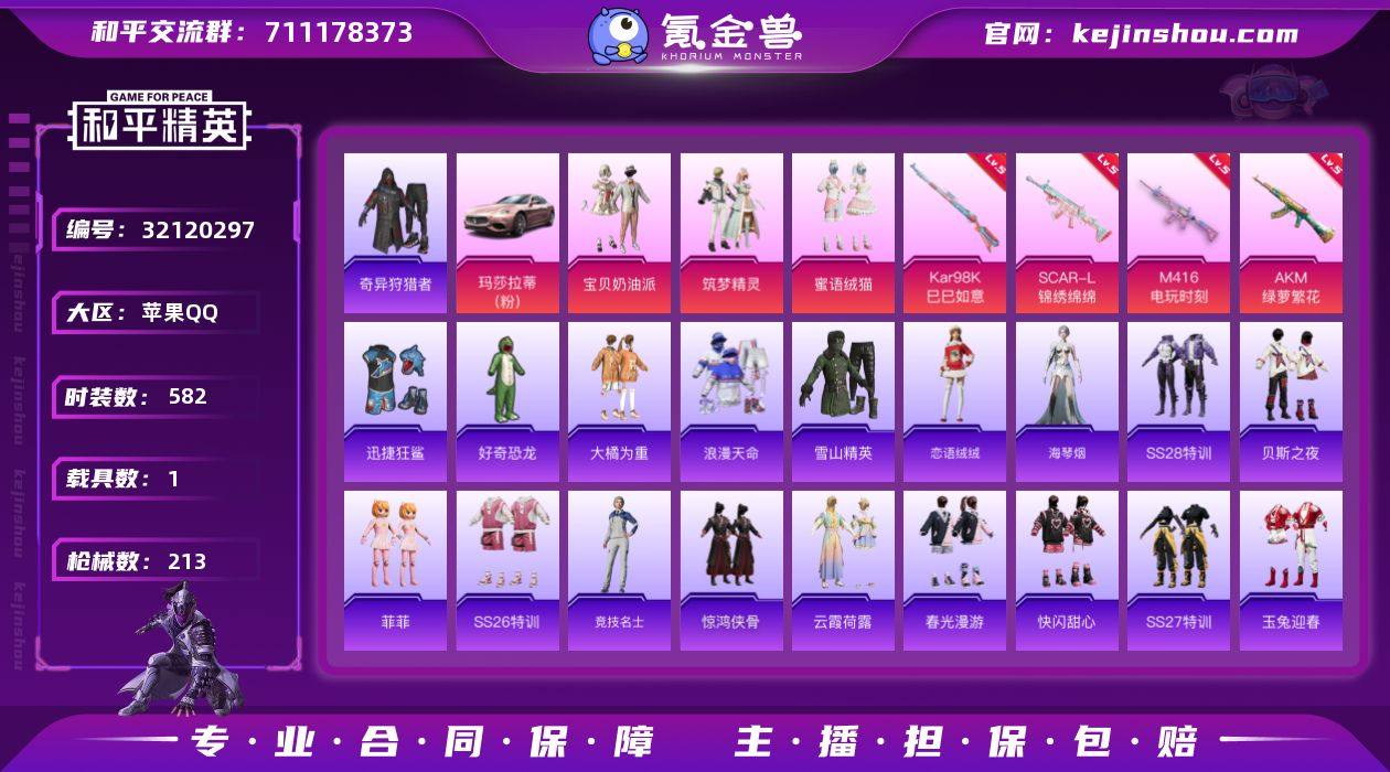 【kyhp727】苹果 手Q-2粉装-6特效枪-0载具-2粉色飞行器-34323热力值-8王牌印记-70套装-110枪皮 【热门品类】:套装-小丑鱼,套装-龟仙人 【粉色套装】:粉装-蝶舞迷情,粉装-幻彩电音 【粉色枪皮等级】:SCAR-L-锦绣绵绵(五级),UMP45-萌骑冒险(三级),Kar98K-巳巳如意(五级),Mk14-福马献瑞(五级),DP-28-豹影疾电(五级),平底锅-喜羊羊与灰太狼(七级) 【粉色枪皮】:SCAR-L-锦绣绵绵,UMP45-萌骑冒险,Kar98K-巳巳如意,Mk14-福马献瑞,DP-28-豹影疾电,平底锅-喜羊羊与灰太狼 【粉色飞行器】:繁龙极客飞行器,幻星舰长飞行器 【粉色降落伞】:幻影战神降落伞,炫光之旅降落伞,沙丘之主降落伞,创世·救赎降落伞,异瞳寒姬降落伞,炫彩糖果降落伞 【稀有套装】:套装-龟仙人,套装-马上有钱,套装-星影赞美诗,套装-云朵鹅,套装-雪绒豹,套装-蓝海鲸歌,套装-朱霞炽焰,套装-凌霄紫焰,角色-申公豹,套装-雨过天青,套装-红釉青花 【稀有枪皮】:AKM-奇异狩猎者,AKM-影袭,AKM-江南烟雨,AKM-龙的传人,SCAR-L-黄金龙骨,M416-糯团青竹,AUG-耀粉歌者,M762-镜中幻,M762-云朵鹅,AC-VAL-天降萌叽,AC-VAL-快闪甜心,蜜獾-天降萌叽,ARX-凌霄紫焰,UZI-啾咪啾咪,UZI-天降萌叽,UZI-幻影战神,UZI-月影灵韵,UMP45-炫光之旅,Vector-焰鹰斗篷,Vector-生命誓言,汤姆逊-天降萌叽,汤姆逊-幻影战神,JS9-凌霄紫焰,P90-快闪甜心,Kar98K-彩虹符号,AWM-焰鹰斗篷,AWM-恐龙拽拽,SKS-炫彩节奏,SKS-迅猛狂鲨,Mini14-炫彩节奏,M417-惊鸿侠骨,MK20-H-快闪甜心,M200-惊鸿侠骨,SVD-云朵鹅,SVD-冷漠罗丽,S686-红色方程式,S12K-幻影战神,DBS-焰鹰斗篷,SPAS-12-云朵鹅,M249-沙丘之主,M249-糯团青竹,DP-28-焰鹰斗篷,MG3-幻世战舞者,MG3-惊鸿侠骨,MG-36-凌霄紫焰,P92-凌霄紫焰,沙漠之鹰-快闪甜心,沙...