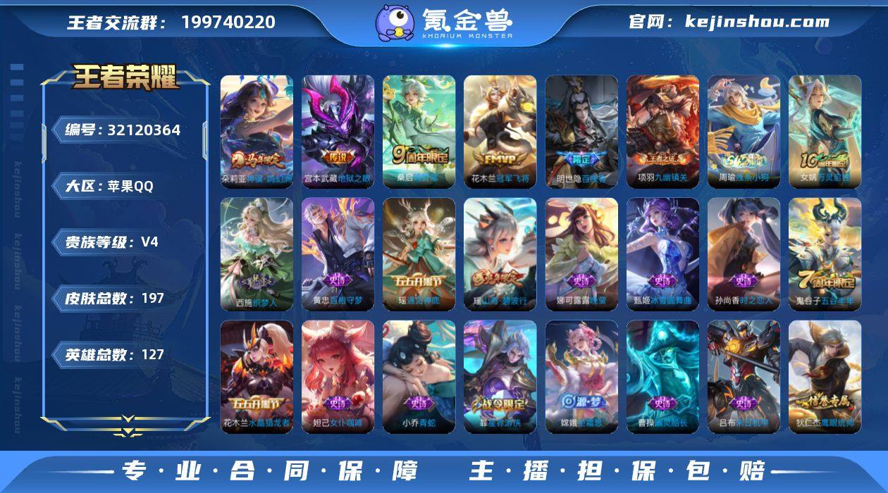 苹果Q 可二次 4传说127英雄197皮肤 神骥鸣幻洲 鸣野蒿 冠军飞将 地狱之眼 万灵启世 百晓客 山海碧波行 拒霜思 冰冠公主 原初追逐者 黎明之约 诗语江南 织梦人 黄忠百相守梦 真我赫兹镜 遇见神鹿 水晶猎龙者 暗隐猎兽者 猫狗日记男 猫狗日记女 特工战影 白蛇 女武神 青蛇 蔷薇恋人 黄金分割率 舞动绿茵 逐浪之夏 心灵战警 晚萤 功夫厨神 圣诞恋歌 幽灵船长 末日机甲男 星夜王子 节奏热浪 绅士熊喵 时之恋人女 暗夜贵公子 街头霸王 摇滚巨星 缤纷独角兽 顽岩魄 游园惊梦 五谷丰年 鹰眼统帅 王者荣耀账号