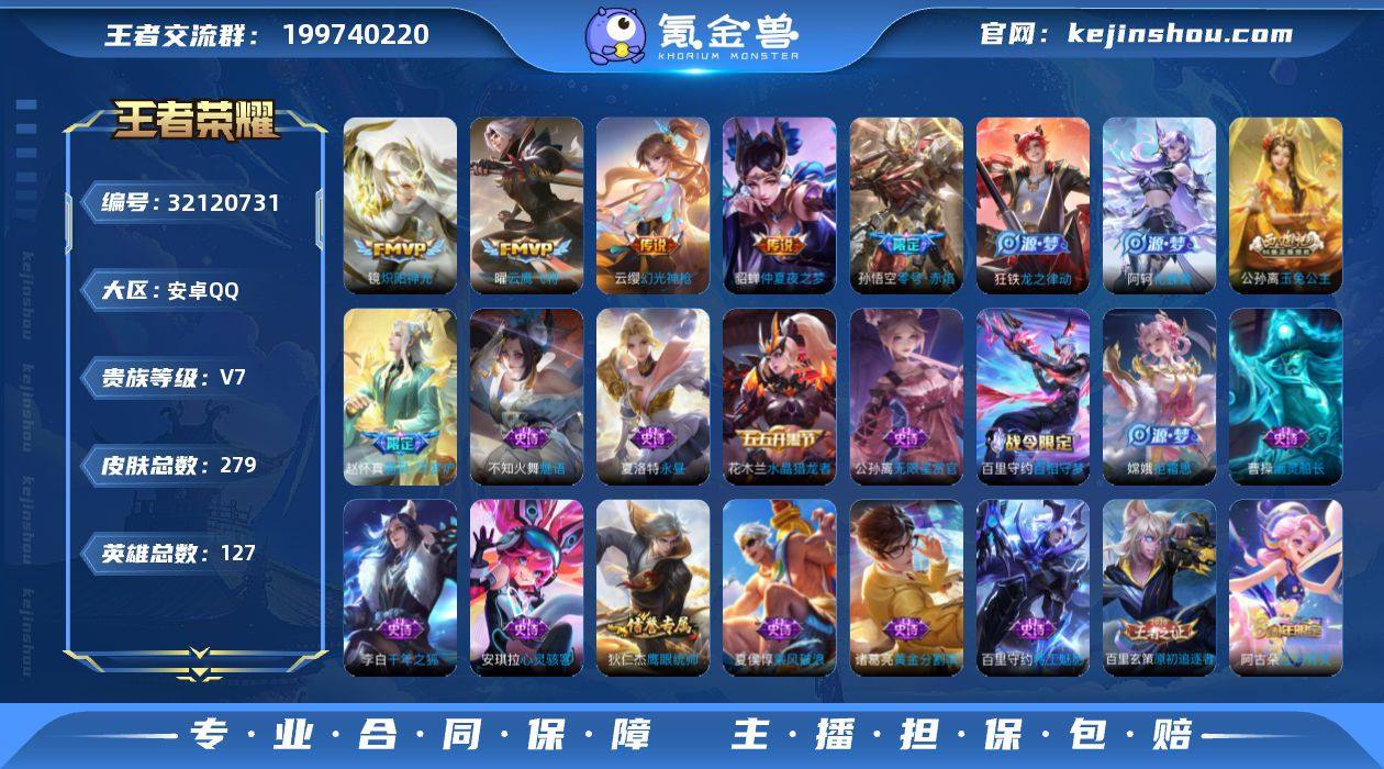 V7 1典藏 7传说 127英雄 279皮肤 可修改实名 男号 【英雄全皮】蚩奼全皮,刘邦全皮,影全皮 【稀有英雄】敖隐(小龙人),大司命,嬴政(始皇帝),韩信(韩跳跳),夏洛特(夏师傅),艾琳,橘右京(橘子),娜可露露(鸟人),不知火舞,赵云,金蝉(唐僧),戈娅 【荣耀水晶】九霄神辉(木兰典藏) 【传说皮】幻光神枪,零号·赤焰,仲夏夜之梦(大飞蛾),末日机甲-孙尚香(绿蚂蚱),云鹰飞将(小将军),炽阳神光 【珍宝阁皮】优雅恋人,女武神 【赛季/战令皮】噬灭天穹(s37),古海寻踪(s33),星界游侠,海盐诗旅(s30),擒涛扼浪(s31),潮玩骑兵,奇幻香踪,探海日志(s32),流音漫舞,顽趣-梦奇,地狱燃心,剑破天穹(s35),天穹祈灯(s34),青焰无极,苍威无极,天穹之誓(s36),蔡文姬夏日便利店,虞姬夏日便利店,暖冬·兔眠,混沌棋(s18),疑决卦(s19),醍醐杖(s20),原初探秘者(s21),万华元夜(s22),演武夺筹(s23),驱傩正仪(s24),千军破阵(s25),夺宝奇兵,迷踪丽影,暗影游猎(游乐娃子),单词大作战,潮玩骑士王,星际陆战队-达摩,神迹守卫-墨子,航海奇遇记,圣弓游侠,真爱魔法,火炮绅士,沙漠行僧(s26),幻夜卜梦,金庭之子(s27),电玩高手(电玩铁子),午后时光,大漠名商(s28),云中旅人(s29),超时空战士-钟无艳,落雪兰心 【史诗皮】星界战将,百相守梦-百里守约,茶境仙,战舞者,蒙犽顽岩魄,器灵·浮梦炉,化蝶舞,龙之律动,紫霞仙子,苍穹之光,黄金分割率,特工魅影,千年之狐,永昼,江河有灵,蒙恬荣光圣徽,百解令(蒙犽),高渐离燃音魔法,无限星赏官,冰冠公主,偶像歌手,魅语,猫狗日记-孙策,乱世虎臣,节奏热浪,摇滚巨星,水果甜心,天才门将,心灵骇客,功夫厨神,德古拉伯爵,暗隐猎兽者,幽灵船长,鬼剑武藏,心灵战警,地狱岩魂,拒霜思,缤纷独角兽,乘风破浪,逐浪之夏,月团寄思,水晶猎龙者,金属风暴,原初追逐者,圣诞狂欢,鹰眼统帅,魅力维加斯,黎明之约,无心,未来纪元-赵云 【限定皮】逐