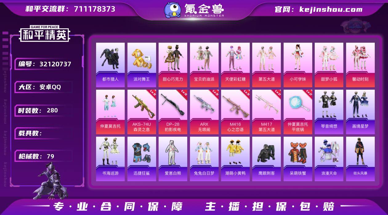 【特价出售】安卓Q-4稀有8粉装9特效枪10热门66套装79枪皮 28626热力值 4印记 历史卓越王牌6星 【4稀有】 都市猎人 浪漫天命 派对舞王 派对舞王(金靴子) 【8粉装】 宝贝奶油派 天使彩虹糖 甜心巧克力 小可学妹 仲夏莫吉托 第五大道 甜梦小狐 馨动时刻 【9特效枪】 M416-心之恋语 (5级) AKS-74U-森灵之息 (5级) DP-28-豹影疾电 (5级) ARX-无垠阁 (5级) M417-第五大道 (2级) AKS-74U-森灵之息 (5级) Mk14-福马献瑞 (5级) UMP45-萌骑冒险 (2级) 平底锅-仲夏莫吉托 (2级) 【10热门】 潮萌小黄鸭 软软马卡龙 晶辉守护 爱崽白熊 呆萌铁蟹 鹰眼刺客 兔兔白日梦 迅捷狂鲨 忍者信条 漫步者 【1头盔】 甜心宝贝头盔 【2背包】 甜心宝贝背包 幻影战神背包