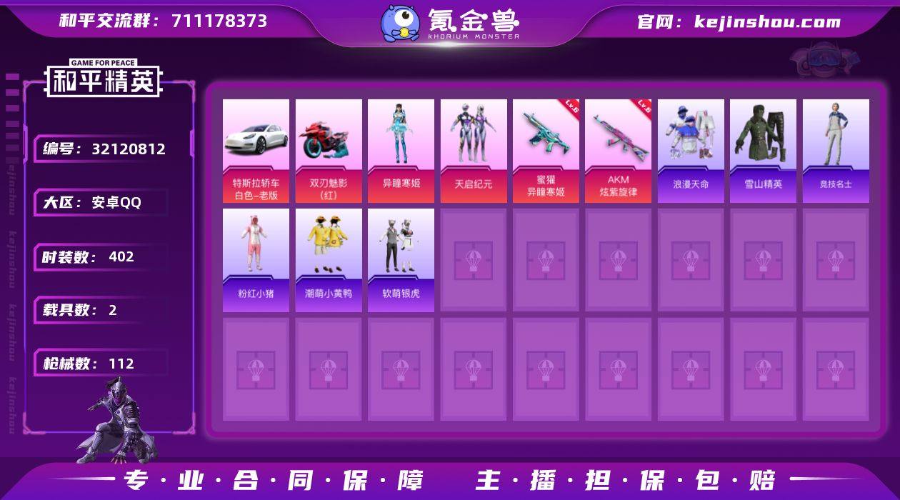 【特价出售】钱包不能注销安卓Q-1稀有2载具2粉装4特效枪10热门94套装112枪皮 36657热力值 3印记 历史卓越王牌9星 【1稀有】 浪漫天命 【2载具】 特斯拉3白色 双刃魅影红色 【2粉装】 天启纪元 异瞳寒姬 【4特效枪】 AKM-炫紫旋律 (6级) 蜜獾-异瞳寒姬 (6级) Mk14-福马献瑞 (2级) ACE32-萌骑漫游 (3级) 【10热门】 雪山精英 潮萌小黄鸭 软萌银虎 九霄 粉红小猪 忍者信条 机械英豪 破蛋小黄鸡 风华少年志 白月香洋装 【1飞行器】 阿狸红飞行器 【3头盔】 九霄头盔 金风玉露头盔 马卡龙头盔 【3背包】 九霄背包 智能音符背包 神秘黑猫背包