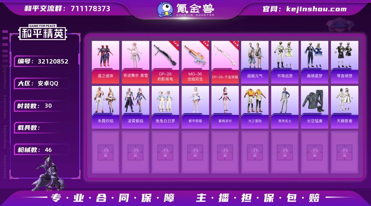 安卓 【小号粉装星之彼岸】手Q-2粉装-4特效枪-0载具-2粉色飞行器-15852热力值-2王牌印记-30套装-46枪皮 【粉色套装】:粉装-星之彼岸,角色-奇迹舞步 美雪 【粉色枪皮等级】:M249-霁蓝缠春(六级),DP-28-千金淑猫(四级),DP-28-豹影疾电(五级),MG-36-沧焰双生(四级) 【粉色枪皮】:M249-霁蓝缠春,DP-28-千金淑猫,DP-28-豹影疾电,MG-36-沧焰双生 【粉色飞行器】:绝对恒星飞行器,炫彩糖果飞行器 【粉色降落伞】:樱桃泡泡降落伞,绯穹魔姬降落伞,异瞳寒姬降落伞,炫彩糖果降落伞 【稀有套装】:套装-超能元气,套装-雪国风尚,套装-炫彩糖果,角色-都市丽猫,角色-蜜桃派对,套装-朱霞炽焰,套装-凌霄紫焰,套装-书海巡游,套装-画境星梦,套装-琴音绮想 【稀有枪皮】:AUG-冰晶雪宝,AKM-星之彼岸,SCAR-L-炫彩节奏,G36C-暗夜玫瑰,ACE32-画境星梦,ARX-凌霄紫焰,MP5K-画境星梦,JS9-凌霄紫焰,AWM-暮色玫影,M1加兰德-画境星梦,AA12-G-画境星梦,M249-彩虹符号,M249-绯穹魔姬,MG3-幻世战舞者,MG-36-凌霄紫焰,P92-凌霄紫焰,蝎式手枪-千金淑猫,撬棍-暮色玫影,平底锅-凌霄紫焰,平底锅-画境星梦 【其他套装】:套装-光之冒险,套装-竞技名士,套装-长空猛禽,套装-天籁歌者,套装-兔兔白日梦 【营地ID】:995042574