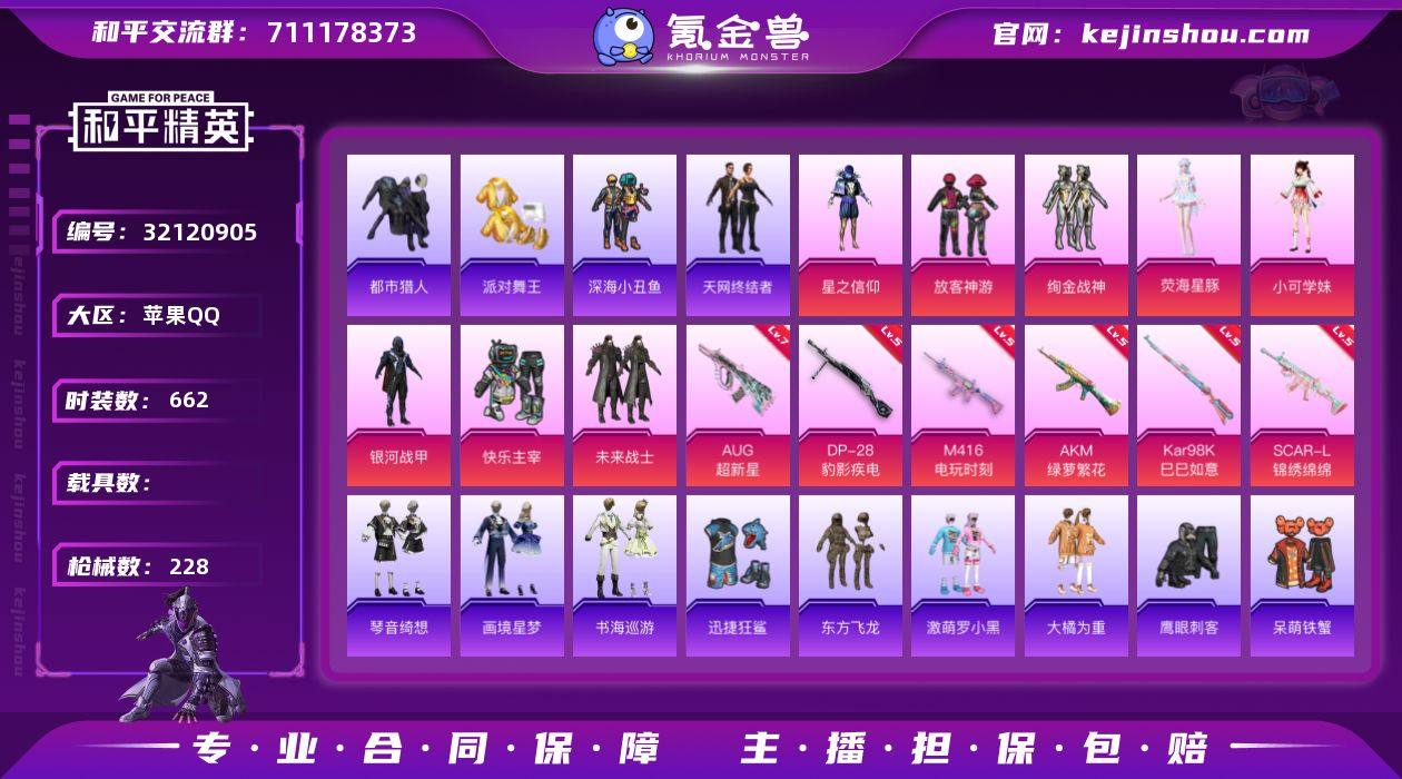 【特价出售】苹果Q-8稀有8粉装8特效枪21热门170套装228枪皮 67324热力值 12印记 历史卓越王牌16星 【8稀有】 AWM-黄金龙骨 M416-星际漫游 AKM-缤纷海域 都市猎人 浪漫天命 派对舞王 天网终结者 派对舞王(金靴子) 【8粉装】 荧海星豚 银河战甲 小可学妹 放客神游 快乐主宰 星之信仰 未来战士 绚金战神 【8特效枪】 SCAR-L-锦绣绵绵 (5级) M416-电玩时刻 (5级) AKM-绿萝繁花 (5级) Kar98K-巳巳如意 (5级) DP-28-豹影疾电 (5级) AUG-超新星 (7级) Mk14-福马献瑞 (5级) ACE32-萌骑漫游 (3级) 【21热门】 小丑鱼 龟仙人 东方飞龙 动感兔斯基 呆萌铁蟹 万圣娃娃 鹰眼刺客 激萌罗小黑 迅捷狂鲨 深海小丑鱼 大橘为重 金羽特工 TT战队服 暗影哥特 忍者信条 水银刺客 漫步者 军刀雅典娜 弄潮海豚 M762-奇异狩猎者 S686-奇异狩猎者 【4头盔】 国宝胖达头盔 银河战甲头盔 甜心宝贝头盔 幻影战神头盔 【2背包】 幻影战神背包 萌熊伴侣背包