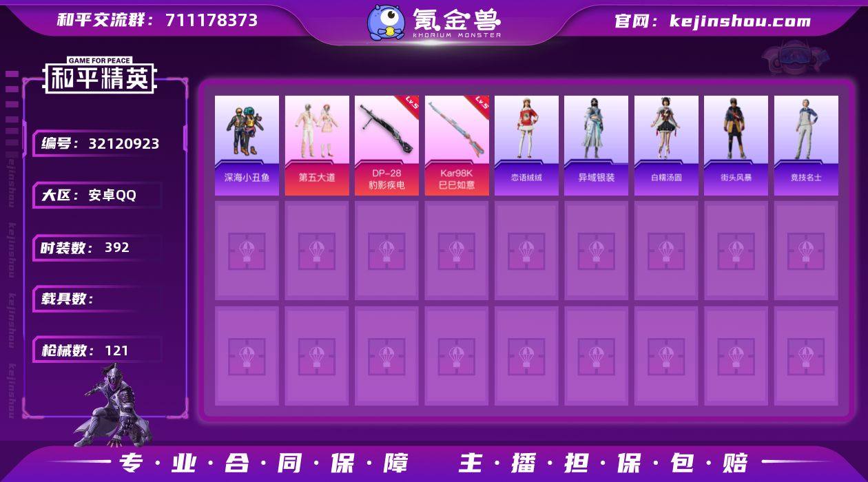 【特价出售】安卓Q-1粉装4特效枪4热门89套装121枪皮 28813热力值 1印记 历史超级王牌2星 【1粉装】 第五大道 【4特效枪】 Kar98K-巳巳如意 (5级) DP-28-豹影疾电 (5级) Mk14-福马献瑞 (5级) AA12-G-萌骑幻想 (4级) 【4热门】 深海小丑鱼 破蛋小黄鸡 极速红龙 弄潮海豚 【1背包】 深海小丑鱼背包