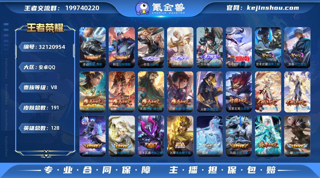 贵族等级:V8 典藏皮肤数:2 珍品无双皮肤数:0 无双皮肤数:3 珍品传说皮肤数:1 传说皮肤数:22 史诗皮肤数:59 皮肤数:191 英雄数:128 段位:荣耀王者 卖家说:QQ有会员