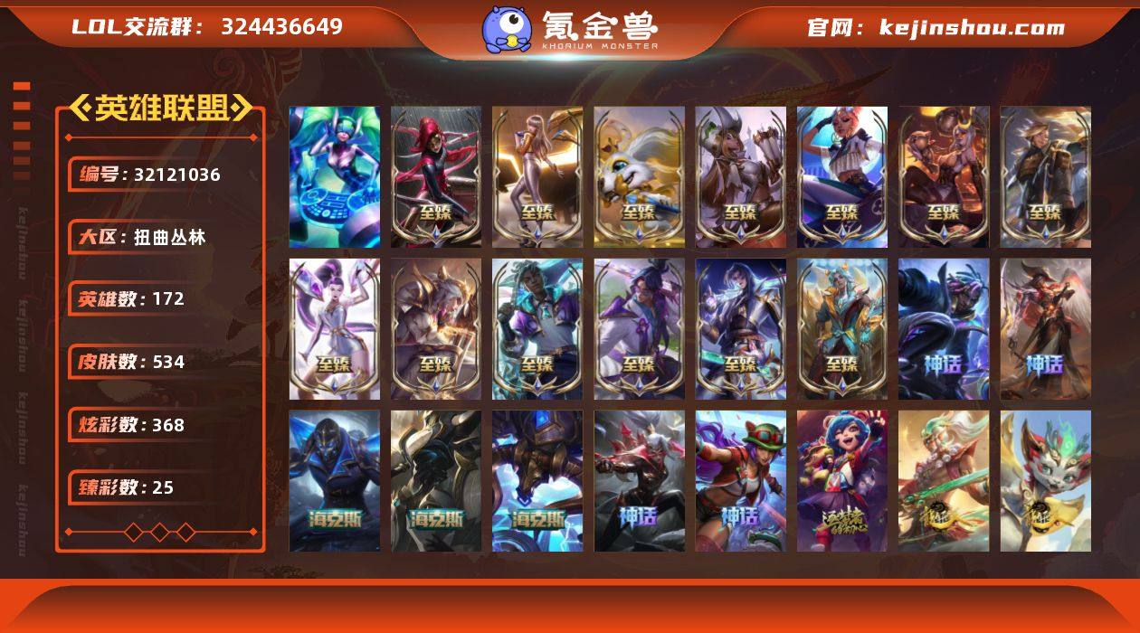 【炽天使永恩】铂金段位-172英雄-534皮肤-368炫彩-1终极-26神话-69限定-55传说-109史诗 【神话皮肤】:十周年纪念安妮,十五周年纪念希维尔,神凰行者瑞羽圣凰艾尼维亚,殿堂传奇薇恩,真实伤害突破界限艾克,西部魔影炽天使永恩,海克斯科技阿利斯塔,海克斯科技卡萨丁,零之枪骑赫卡里姆,至臻真实伤害奇亚娜,至臻天龙之子伊泽瑞尔,至臻KDAALLOUT卡莎,至臻KDA卡莎,至臻烈焰美人薇恩,至臻灵魂莲华易,至臻灵能特工伊泽瑞尔,至臻魅惑女巫厄运小姐,至臻女帝黛安娜,至臻绒毛菲兹,至臻星之守护者艾克,至臻心之钢永恩 【热门头像】:爱意绵绵头像,KDA阿卡丽头像 【至臻皮肤】:至臻灵魂莲华易,至臻魅惑女巫厄运小姐,至臻黑色玫瑰假面舞会卡特琳娜,至臻暗裔英雄嘉文四世,至臻烈焰美人薇恩,至臻灵能特工伊泽瑞尔,至臻天龙之子伊泽瑞尔,至臻绒毛菲兹,至臻女帝黛安娜,至臻永恒星灵佐伊,至臻KDA卡莎,至臻KDAALLOUT卡莎,至臻灵魂莲华劫,至臻星之守护者艾克,至臻真实伤害奇亚娜,至臻莲华温泉厄斐琉斯,至臻心之钢永恩 【臻彩皮肤】:天龙之子卡莎飞龙乘云,无畏骑士瑟庄妮赤子初心,替父从军花木兰炫金龙刃,墨之影武者亚索金墨耀影,征服者阿利斯塔炫金,神龙尊者圣龙李青龙腾云起,弹幕天使卡莎炽天使勇敢,西部魔影卢锡安贝利尔之怠,黎明使者锐雯黑夜使者,星之守护者金克丝黑洞,西部天使赛娜贝利尔之怠,最终BOSS维迦里大魔王,可爱可爱粉红红布里茨,魔女阿卡丽虚荣,净雪之月莫甘娜冬虹,水晶玫瑰迦娜甜蜜花蕾,心之钢伊泽瑞尔天纵才华 【年限皮肤】:醒狮克格莫,司马懿仲达,王国机神白虎贾克斯,天龙之子易,天龙之子斯莫德,龙马烈焰波比 【海克斯皮肤】:海克斯科技阿利斯塔,海克斯科技卡萨丁,零之枪骑赫卡里姆 【情人节限定】:觅心游侠卢锡安,水晶玫瑰斯维因,幽梦玫瑰伊莉丝,...