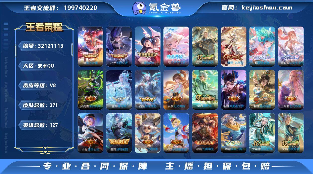 0AT3P3金标大乔,金标瑶,金标王昭君,金标桑启 可二次361皮肤无双1水晶2珍品传说1极品女号传说15优质限定29 信用分正常 钱包已注销 瑶全皮, 水晶皮肤:天鹅之梦,拾光映像, 无双皮肤:真我赫兹(瑶), 珍品传说皮肤:大耳狗之梦, 新传说限定:愿照·九州拓, 传说限定:遇见胡旋,朵莉亚心动手记,时之祈愿-瑶,启明星使, 新传说皮肤:幻光神枪, 传说皮肤:霜月吟,音你心动-小乔,乞巧织情,游龙清影,末日机甲-孙尚香,飞鸢探春,小动物乐团,仲夏夜之梦,鸣野蒿, 新史诗限定:罗小黑战记-百里玄策,万灵启世,涂山容容,幻珠鲛人,织梦人, 史诗限定:神威,东方月初,孙行者,时之彼端,女儿国国王,凤凰于飞,如梦令-嫦娥,海诺心动手记,霸王别姬-虞姬,蜜橘之夏,云端筑梦师,玄嵩,奇迹圣诞,白鹤梁神女,山海·碧波行,涂山红红,天狼绘梦者,天狼溯光者,天狼运算者, 新史诗皮肤:灵蛊蚀心,百相守梦-黄忠, 优质史诗皮肤:暗渊魔法,晚萤,修罗,青蛇,时之奇旅-安琪拉,魅语,诗语江南,白蛇,遇见神鹿, 周年皮肤:李小龙,江河有灵,游园惊梦,遇见飞天,梁祝,鹤鸣心笺,神树通天,高山流水,五谷丰年, 珍宝阁:妄想食味,玩趣恶龙,女武神, 史诗皮肤:地狱岩魂,星夜王子,圣诞狂欢,末日机甲-吕布,无心,乘风破浪,幽灵船长,功夫厨神,德古拉伯爵,水晶猎龙者,心灵战警,猫狗日记-孙策,未来纪元-赵云,节奏热浪,鬼剑武藏,千年之狐,紫霞仙子,暗隐猎兽者,冰冠公主,黎明之约,曙光守护者,原初追逐者,热力回旋,纤云弄巧,缤纷独角兽,金属风暴,魅力维加斯,女仆咖啡,摇滚巨星,暗夜贵公子,冰雪圆舞曲,圣诞恋歌,心灵骇客,偶像歌手,黄金分割率,滕王阁序,月团寄思,拒霜思,水果甜心,鹰眼统帅,逐浪之夏,特工魅影,无限星赏官,绅士熊喵,天才门将,乱世虎臣,舞动绿茵,繁星吟游,猫狗日记-大乔,