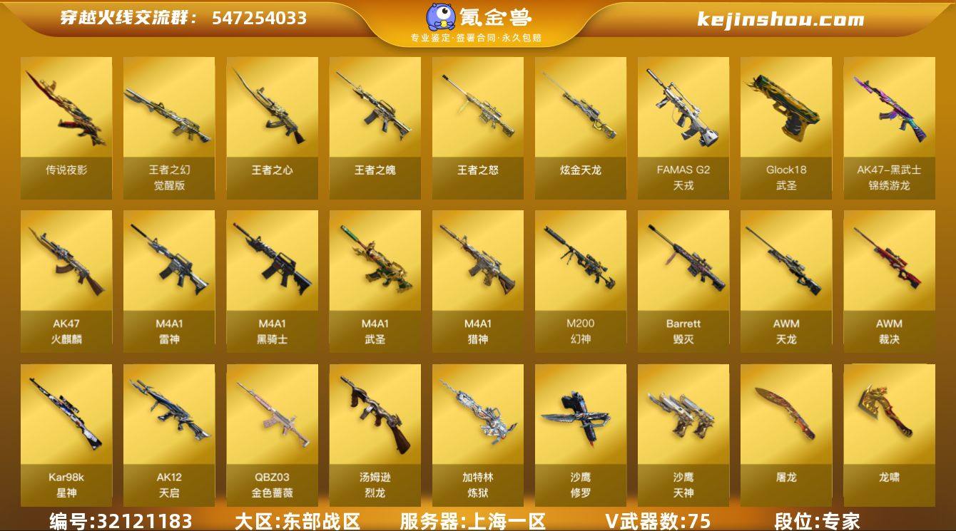 【ky6205】上海一区-83V-4王者武器数-2炫金武器数 【传说武器】:传说夜影 【热门武器】:传说夜影,G36C-幻影,QBZ03-金色蔷薇,M200-幻神,M200-竞技荣光,Kar98K-星神,M4A1-黑骑士,汤姆逊-烈龙,加特林-炼狱,羊驼玩偶*3,裁决-雪莉杨,COP-白鲨,沙鹰-修罗*4,炽芒蝶刃-荣耀世冠白鲨2023 皮肤 【王者炫金武器】:王者之魄,王者之心,王者之怒,炫金天龙*2 【音效卡】:M4A1-黑骑士音效卡,Barrett-毁灭音效卡,AWM-裁决音效卡,Kar98K-星神音效卡 【皮肤】:M200-幻神-荣耀世冠白鲨,幻神-电流骇客 皮肤,金色蔷薇-量子蔷薇 皮肤,裁决-羽掣 皮肤,裁决-星际旅行 皮肤,雷神-星空,雷神-源计划2.0专属 皮肤,毁灭-荣耀之怒,毁灭-星空,毁灭-虹光风暴 皮肤,黑骑士-破浪10年皮肤,黑骑士-破界 皮肤,天龙-能量核心,AWM-天龙-传奇白鲨,屠龙-荣耀之锋,屠龙-破浪逐光 皮肤,炽芒蝶刃-荣耀世冠白鲨2023 皮肤 【角色】:葵,电竞教官-云悠悠,隼,星际战将,幻面灵狐,电竞少女,芳心审判者,风暴女,虎妞,0号玩家,蛇姬,蜀雪,兔囡囡,维纳斯,新娜塔莎,游珑儿,智影 【人偶武器】:COP-白鲨,裁决-雪莉杨,火麒麟-灵狐 【挑战大师】:AK47-冰龙粉碎者 【英雄级武器】:AK47-火麒麟,M4A1-雷神*2,M4A1-黑骑士,AK12-天启,M4A1-武圣,G36C-幻影,黑武士-锦绣游龙,FAMAS G2-天戎,QBZ03-金色蔷薇,M4A1-猎神,王者之幻-觉醒版,HK417-朱雀-电竞之星,AWM-天龙,Barrett-毁灭*2,AWM-裁决,M200-幻神,Kar98K-星神,M200-竞技荣光,加特林-炼狱,汤姆逊-烈龙,沙鹰-修罗*4,沙鹰-天神,柯尔特-竞技荣光*2,Glock18-武圣,屠龙*4,龙啸*2,擎天,擎天-竞技荣光,高爆手雷-竞技荣光*11,高爆手雷-神工天巧,闪光弹-竞技荣光*10,闪光弹-神工天巧,烟雾弹-竞技荣光*9,烟雾弹-神工天巧 【道具】:BS战队炫彩...