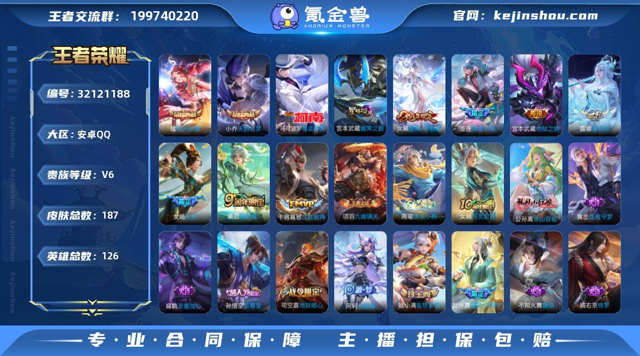 可换绑【女娲金标万战1.19万·干将金标万战1.19万·双典藏·怪盗基德·女娲补天·财神纳福天幕】5083星币 1按键,1星传说,1天幕,11王者印记,五级铭文180,可二次CD17989,安卓Q-V6-187皮肤-2典藏皮肤-1珍品传说-7传说-53史诗【英雄全皮】:敖隐全皮【荣耀典藏】:小乔天鹅之梦,瑶拾光映像【珍品传说】:马可波罗怪盗基德【星元皮肤】:宫本武藏幽冥之眼【天幕】:财神纳福天幕【传说皮肤】:女娲愿照千秋盛,桑启鸣野蒿,亚连落雪白狼,露娜霜月吟,女娲补天,干将莫邪久胜战神,宫本武藏地狱之眼【限定皮肤】:蒙犽顽岩魄,大乔绒语心约,姜子牙天穹之誓,狄仁杰阴阳师,赵云皇家上将,扁鹊奇幻香踪,吕布猎兽之王,狄仁杰魔术师,项羽海滩派对,孙悟空至尊宝,杨戬潮玩骑兵,女娲补天,雅典娜黎明之约,裴擒虎擒涛扼浪,上官婉儿梁祝,嫦娥拒霜思,鲁班大师探海日志,艾琳流音漫舞,司空震地狱燃心,阿古朵江河有灵,张良古海寻踪,蒙恬荣光圣徽,高渐离燃音魔法,妲己灵卜魔法,鬼谷子天穹祈灯,姬小满妄想食味,亚连落雪白狼,沈梦溪龙舞盛年,鲁班七号蔬乡物语,李元芳蔬乡物语,刘邦剑破天穹,程咬金群星魔术团,镜青焰无极,项羽苍威无极,刘备异域游侠,周瑜熔金海岸【年限皮肤】:女娲愿照千秋盛【赛季限定】:裴擒虎擒涛扼浪,鲁班大师探海日志,张良古海寻踪,鬼谷子天穹祈灯,刘邦剑破天穹,姜子牙天穹之誓,东皇太一噬灭天穹,太乙真人谧流熔炉,钟馗虚灵犬护,甄姬逆浪荇歌,亚瑟荣光之誓,雅典娜黎明之约,蒙恬荣光圣徽,牛魔星界战将,项羽九幽镇关【战令限定】:吕布猎兽之王,扁鹊奇幻香踪,杨戬潮玩骑兵,司空震地狱燃心,艾琳流音漫舞,高渐离燃音魔法,妲己灵卜魔法,鲁班七号蔬乡物语,李元芳蔬乡物语,镜青焰无极,项羽苍威无极,亚连破空之剑,孙悟空神迹守卫,百里守约百相守梦,老夫子百...