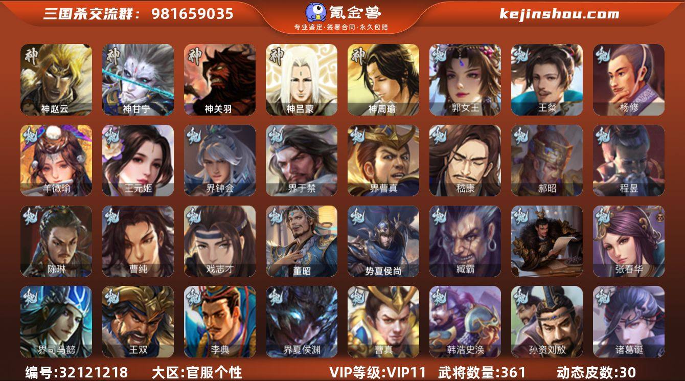 官阶:大将军;VIP等级:VIP11;史诗武将数量:51;动态皮肤数量:30;武将总数:361;史诗宝珠数量:0;将魂数量:1838;神将:2;魏国史诗武将:17;蜀国史诗武将:13;吴国史诗武将:6;群史诗武将:16 神赵云,神甘宁,郭女王,王粲,杨修,羊徽瑜,王元姬,界钟会,界于禁,界曹真,嵇康,郝昭,陈琳,曹纯,戏志才,程昱,关索,马云騄,谋黄忠,谋夏侯氏,谋赵云,谋马超,诸葛瞻,周群,赵襄,张星彩,王平,沙摩柯,花鬘,谋孙策,孙皓,留赞,界朱然,界徐盛,贺齐,左慈,张让,星黄忠,星甘宁,陶谦,审配,麹义,南华老仙,祢衡,沮授,界左慈,界李儒,公孙康,杜预,许攸,兀突骨,神吕蒙,神周瑜,神关羽,势夏侯尚,SP关羽,SP蔡文姬,乐进,曹昂,诸葛诞,朱灵,文聘,SP姜维,张春华,钟会,曹冲,郭淮,满宠,界王异,界曹操,界司马懿,界夏侯惇,界张辽,界许褚,界郭嘉,李典,曹真,韩浩史涣,陈群,曹叡,曹休,钟繇,司马朗,王基,李通,郭皇后,孙资刘放,辛宪英,界甄姬,吕虔,鲁芝,界典韦,界荀彧,杜畿,界曹丕,张恭,界曹植,界满宠,界郭淮,卞夫人,辛毗,界陈群,华歆,蔡贞姬,袁涣,王双,崔琰,毛玠,阮慧,谋徐晃,谋于禁,界夏侯渊,臧霸,唐咨,董昭,SP孙尚香,关银屏,夏侯霸,马良,关兴张苞,廖化,界马岱,关平,简雍,刘封,界法正,界关兴张苞,界刘备,界关羽,界张飞,界赵云,界马超,SP徐庶,吴懿,周仓,张松,刘谌,夏侯氏,糜竺,孙乾,李严,黄皓,界黄月英,界诸葛亮,赵统赵广,严颜,界伊籍,界卧龙诸葛,界庞统,胡金定,张翼,杨仪,傅肜,界简雍,陈震,糜夫人,王甫赵累,界周仓,许靖,彭羕,谋庞统,界张嶷,谋张飞,诸葛果,蒋琬费祎,甘夫人,鲁肃,孙茹,凌操,大乔小乔,诸葛恪,诸葛瑾,孙鲁育,程普,韩当,潘璋马忠,虞翻,朱然,界甘宁,界吕蒙,界黄盖,界周瑜,界大乔,界陆逊,孙鲁班,朱桓,顾雍,孙休,朱治,全琮,阚泽,孙登,岑昏,界孙权,界孙尚香,SP庞统,严畯,吕岱,周鲂,周妃,界孙策,许贡,卫温诸葛直,界吴国太,界凌统,界韩当,界程普,界虞翻,...
