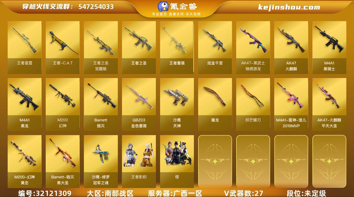 【商品标题】:广西一区-27V-8王者-1炫金 【角色】:王者樱-热浪之夏,王者影豹,青霞仙子 【热门武器】:M200-幻神,炽芒蝶刃,炽芒蝶刃,金色小号,C.A.T,牛牛-AK47,M4A1-黑骑士,QBZ03-街机 【王者炫金武器】:炫金千变,王者之圣,王者蔷薇,王者星霆 【稀有皮肤】:修罗-冠军之魂,幻神-宠儿-2021MVP,M200-幻神-黄忠皮肤,雷神-宠儿-2019MVP,巴雷特-毁灭-CFPL冠军,M200-幻神-N9-2022MVP,火麒麟-平天大圣,火麒麟-心动糖果,AWM-CFS 2020,屠龙-星火燎原,屠龙-星火燎原 【其他皮肤】:AK47-B-常胜将军-孙权,AK47-B-常胜将军-刘备,AK47-青龙,98K-烛龙,M4A1-朋克,M4A1-朋克,M4A1-水枪,M4A1-水枪 【人偶武器】:C.A.T,牛牛-AK47,迷你超能女侍,火麒麟-灵狐,夺魂 【音效卡】:幻神音效卡 【暴走生化】:超级对讲机 【英雄级武器】:黑武士-锦绣游龙,M4A1-黑龙,M4A1-黑骑士,AK47-火麒麟,Barrett-毁灭,沙鹰-天神,沙鹰-天神,屠龙,屠龙,M200-幻神,QBZ03-金色蔷薇,炽芒蝶刃,炽芒蝶刃 【特殊枪械】:0白虎,1黑骑士,0烈龙,0盘龙,0炼狱,0蝴蝶斯泰尔