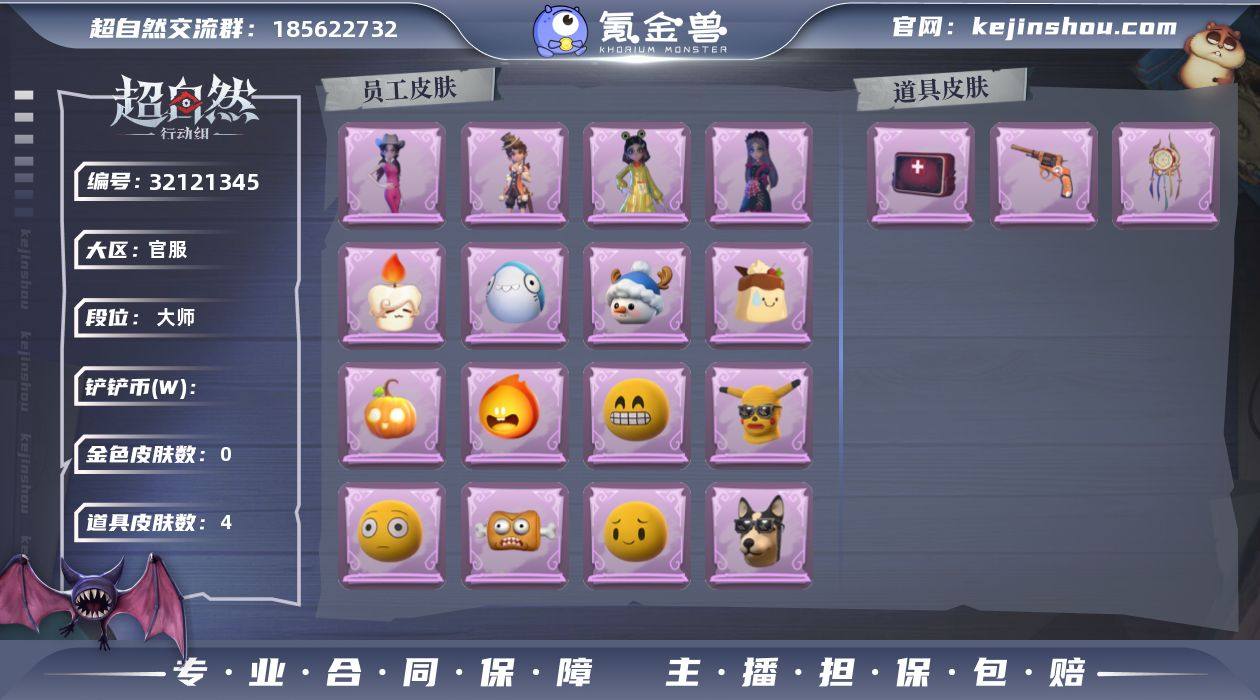 超自然行动组巨人双端账号,历史最高超自然传说184星,当前大师Ⅱ。 资源:400425财产币,37496其他货币。 梦居:秦陵龙宫5级、昆仑秘境6级、精绝古城6级,多套大金(大剑、玉玺、鹿形摆件等)。 限定:福袋小熊猫、福袋小狐狸、圣诞小熊猫、圣诞白鼬,拜年卡-逍遥/莉莉/艾伦,宠物格勒(亲密度70/99)。 可换绑,安全无忧,诚心出,可小刀。