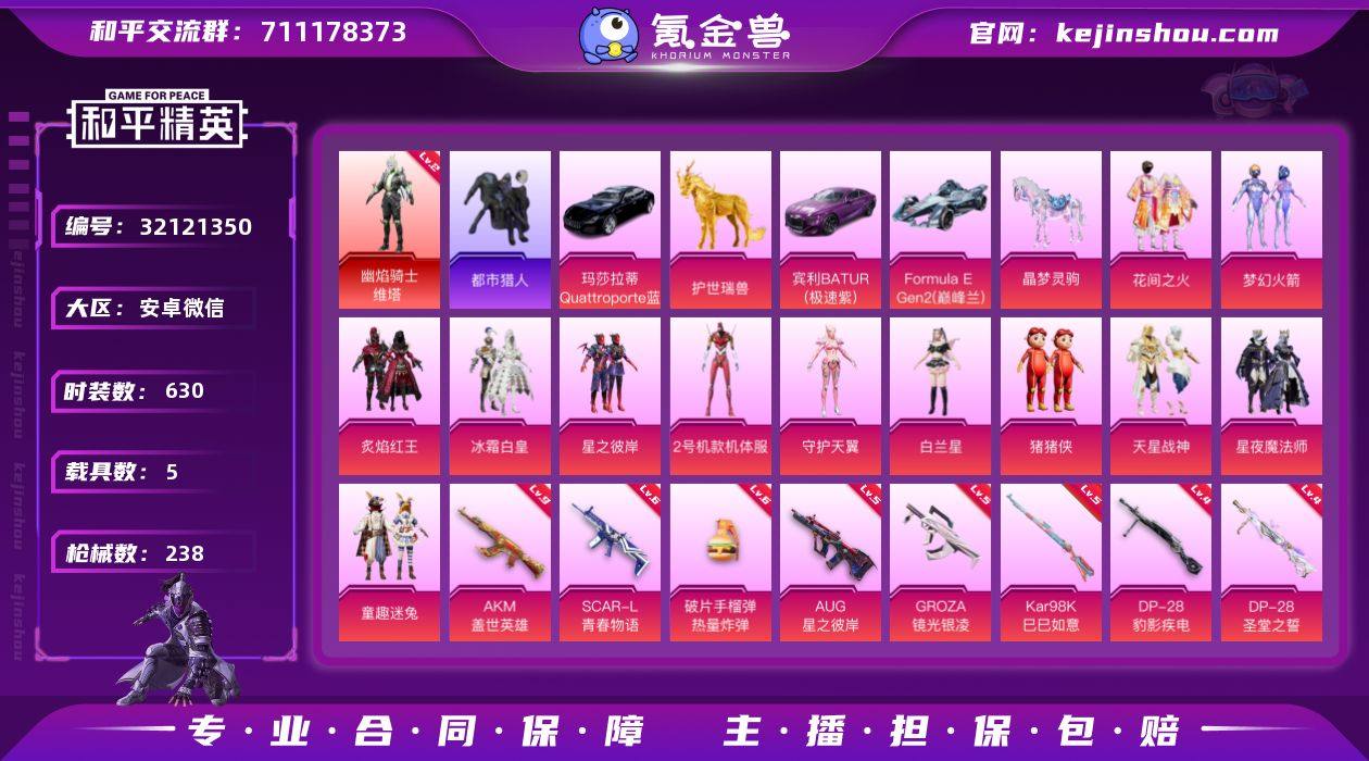 实名:可二次实名 是否支持人脸包赔:支持 粉装数量:12 特效枪数量:13 载具数:5 时装数:630 枪械数:238 都市猎人 二级幽焰骑士-维塔 2号机款机体服,白兰星,冰霜白皇,炙焰红王,花间之火,梦幻火箭,守护天翼,童趣迷兔,天星战神,星夜魔法师,星之彼岸,猪猪侠 九级AKM-盖世英雄,六级破片手榴弹-热量炸弹,六级SCAR-L-青春物语,五级AUG-星之彼岸,五级GROZA-镜光银凌,五级Kar98K-巳巳如意,四级DP-28-豹影疾电,四级DP-28-圣堂之誓,四级GROZA-圣辉之星,四级M416-五爪金龙,四级M762-电糖天使,三级AKM-幽焰骑士,二级M417-第五大道 玛莎拉蒂Quattroporte(夜幕蓝),宾利BATUR(极速紫),Formula E Gen2(巅峰兰),护世瑞兽,晶梦灵驹 SS37特训,馥郁金蕊,画境星梦,琴音绮想,SS36特训,萌鸡速递,SS35特训,薄荷星砂,SS34特训套装,冰川特警,冰冻风暴,缤纷果语,贝斯之夜,白熊同盟,春光漫游,长空猛禽,潮流游乐家,春日漫步,春野茶蘼,纯真浪花,顶瓜瓜,蝶变,大橘大利,呆萌铁蟹,都市丽猫,都市猎人,短笛,飞驰魅影,绯格组合,粉红小猪,飞行日记,格斗先锋,龟仙人,光之冒险,幻彩翩翩,海岛探路者,鹤鸣,华贵领队,湖蓝色名流,活力之心,黄色伏地魔,幻世战舞者,和煦暖阳,幻羽潜行,绝对偶像,金戈铁马,晶辉守护,惊鸿侠骨,娇憨猪猪,竞技名士,晶灵使者,坚韧舞者,极速竞梦,街头风暴,军械专家,锦衣飞扬,空岛之星,快乐星愿,快闪甜心,狂沙舞者,蓝调潮人,龙的传人,烈火街头,龙魂突击队,猎鹰,镭金极速,黎明保卫者,猎梦纪元,灵蜜圈圈,浪漫天命,李逍遥,恋语绒绒,冷焰舞者,漫步者,猛禽,妙红点点,梦幻奶油,棉花软糖,萌黄之夏,魅力单车,麻辣教官,懵萌河马,曼妙人鱼,萌趣咩咩,明日香款战斗服,霓虹街区,霓虹闪烁,柠萌假日,牛气冲天,牛气满满,轻风白浪,青芒树下,青团波波,青玉碎影,青羽突袭者,荣耀,热情海星,热血青春,深蓝色名流,沙漠兵团,神气柴柴,SS18特训,SS19特训,SS20特训,SS21特训,SS22特训,SS23特训,SS24特训,SS25特训,SS26特训,SS27特训,SS28特训,SS29特训,SS30特训套装,SS31特训套装,SS32特训套装,SS33特训套装,巳巳如意,石蕴玉辉,探宝勇士,甜蜜菠萝,甜梦熊熊,特殊使命,糖霜甜心,涂山之恋,糖糖葫芦,甜心亚梦,田园牧歌,完美偶像,王牌教练,小丑鱼,迅捷狂鲨,薰款战斗服,炫蓝之夏,星梦畅游,许七安,旭日情侣,夏日音浪,香桃花海,星途旅人,香榭午后,虚音幻奏,音速流光,玉兔迎春,野性战心,鹰眼刺客,焰鹰斗篷,鱼渊荷华,幽夜迷踪,燕燕于飞,异域银装,智谋强哥 酣梦熊熊飞行器,深渊漩涡飞行器,祥瑞起舞飞行器,星之彼岸飞行器,炎氏战神飞行翼,动力核心降落伞,晶梦幻蝶降落伞,金蛇镇世降落伞,临安公主降落伞,梦幻火箭降落伞,墨龙九天降落伞,圣堂之誓降落伞,童趣迷兔降落伞,音爆索尼克降落伞,幽焰骑士降落伞,筑梦精灵降落伞 卖家说:有螳螂有火箭少女101有都市有小丑鱼有红装升级枪还有六级的手榴弹两个马匹三个车皮三个双人飞行器。该有的都有还有一些和平小店买的散件