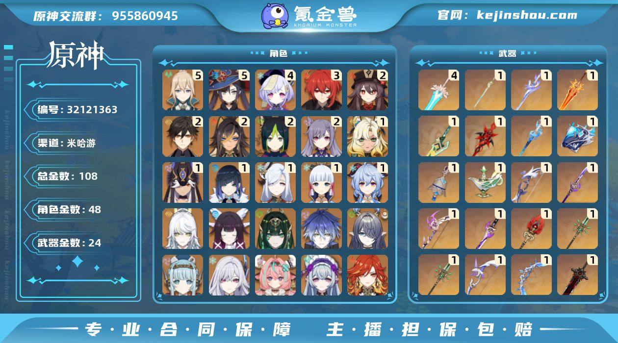 冒险等级:60 总黄数:108 5星角色数:48 5星武器数:24 原石数量:408 相遇之缘数量:0 纠缠之源数量:0 5命琴,5命莫娜,4命七七,3命迪卢克,2命胡桃,2命钟离,2命迪希雅,2命提纳里,2命刻晴,1命希诺宁,1命赛诺,1命夜兰,1命申鹤,1命神里绫华,1命甘雨,0命兹白,0命哥伦比娅,0命奈芙尔,0命菲林斯,0命菈乌玛,0命伊涅芙,0命丝柯克,0命瓦雷莎,0命梦见月瑞希,0命玛薇卡,0命茜特菈莉,0命恰斯卡,0命基尼奇,0命玛拉妮,0命艾梅莉埃,0命阿蕾奇诺,0命闲云,0命娜维娅,0命芙宁娜,0命莱欧斯利,0命那维莱特,0命林尼,0命艾尔海森,0命流浪者,0命纳西妲,0命妮露,0命神里绫人,0命八重神子,0命魈,0命珊瑚宫心海,0命雷电将军,0命枫原万叶,0命达达利亚 6命班尼特,6命嘉明,6命久岐忍,6命卡齐娜,6命琳妮特,6命欧洛伦,6命香菱,6命行秋,6命夏沃蕾,6命芭芭拉,6命北斗,6命重云,6命迪奥娜,6命多莉,6命珐露珊,6命菲谢尔,6命九条裟罗,6命坎蒂丝,6命柯莱,6命雷泽,6命罗莎莉亚,6命莱依拉,6命诺艾尔,6命凝光,6命砂糖,6命托马,6命辛焱,6命烟绯,6命瑶瑶,6命云堇,6命早柚,5命菲米尼,4命爱诺,4命绮良良,4命赛索斯,4命卡维,4命丽莎,3命伊法,3命凯亚,3命五郎,2命蓝砚,2命夏洛蒂,2命鹿野院平藏,2命米卡,1命叶洛亚,1命塔利雅,1命伊安珊,1命安柏,0命埃洛伊 精4天空之傲,精1朏魄含光,精1苍耀,精1焚曜千阳,精1山王长牙,精1赤月之形,精1静水流涌之辉,精1万世流涌大典,精1图莱杜拉的回忆,精1千夜浮梦,精1若水,精1薙草之稻光,精1飞雷之弦振,精1雾切之回光,精1护摩之杖,精1和璞鸢,精1阿莫斯之弓,精1冬极白星,精1狼的末路,精1风鹰剑,精1天空之卷,精1四风原典 100%侦察骑士,古恩希尔德的传承,帆影游风,极夜真梦,冷花幽露,倩影游侠,宿雪桃红,岁夜欢哗,闪耀协奏,纱中幽兰,玄玉瑶芳,星与月之约,雨化竹身,叶隐芳名,致教会自由人 卖家说:原神、崩铁、绝区零一体号