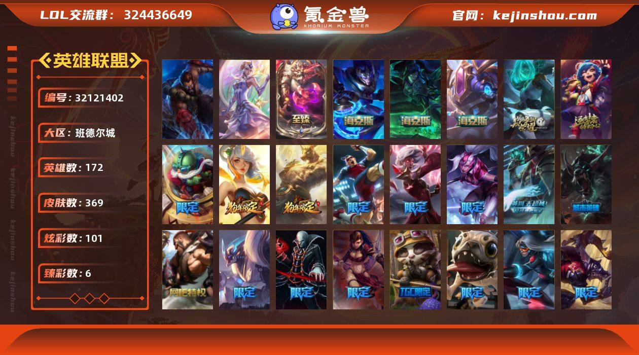 未定级段位-172英雄-369皮肤-101炫彩-2终极-6神话-82限定-40传说-89史诗 【神话皮肤】:十周年纪念安妮,源代码乐芙兰,海克斯科技嘉文四世,海克斯科技克格莫,摄魂使者薇恩,至臻神龙尊者均衡之龙沃利贝尔 【珍稀头像】:至爱的鹿头像 【热门头像】:春晖神女头像,SSG霞头像,玉剑传说舞剑仙头像 【至臻皮肤】:至臻神龙尊者均衡之龙沃利贝尔 【臻彩皮肤】:天龙之子卡莎飞龙乘云,玉剑传说舞剑仙轩辕,冠军之矛卡莉丝塔凯旋圣装,魔女阿卡丽虚荣,净雪之月莫甘娜冬虹,红莲之刃锐雯 【年限皮肤】:北辰之威内瑟斯,春晖神女拉克丝 【海克斯皮肤】:海克斯科技嘉文四世,摄魂使者薇恩,海克斯科技克格莫 【情人节限定】:甜心宝贝娑娜,觅心猎手薇恩,觅心之翼奎因,觅心游侠卢锡安,觅心女王艾希 【冰雪限定】:幸福女神乐芙兰,冰雪风暴希维尔,圣诞精灵崔丝塔娜,圣诞狂欢努努和威朗普,圣诞狂欢基兰,平安夜女神娑娜,邪恶圣诞老人维迦,夺命美人卡特琳娜,雪默丁格,雪装奈德丽,圣诞驯鹿克格莫,冰雪节辛吉德,冰雪节格雷福斯,冰雪女神辛德拉,冰雪兽纳尔 【终极皮肤】:大元素使拉克丝,灵魂守卫乌迪尔 【限定皮肤】:钢铁军团拉克丝,诺斯费拉图弗拉基米尔,地底世界崔斯特,冠军之矛卡莉丝塔,冠军之箭艾希,冠军掠夺者卡兹克,Fnatic嘉文四世,暗杀星蒙多,暗杀星慎,暗杀星伊泽瑞尔,SKTT1贾克斯,SKTT1李青,SSW辛吉德,SSW图奇,SSW锤石,SKTT1阿利斯塔,SKTT1阿兹尔,SKTT1卡莉丝塔,SKTT1雷克顿,SKTT1瑞兹,SKTT1伊莉丝,SKTT1艾克,SKTT1奥拉夫,SKTT1烬,SKTT1娜美,SKTT1辛德拉,SKTT1扎克,SSG伊泽瑞尔,SSG塔莉垭,SSG霞,星之守护者伊泽瑞尔,玉剑传说舞剑仙,暗裔英雄盖伦,胜利女神奥莉安娜,胜利之剑亚托克斯,胜利枪神卢锡安,胜利机器人布里茨,胜利女神瑟庄妮,胜利剑圣易,南瓜...