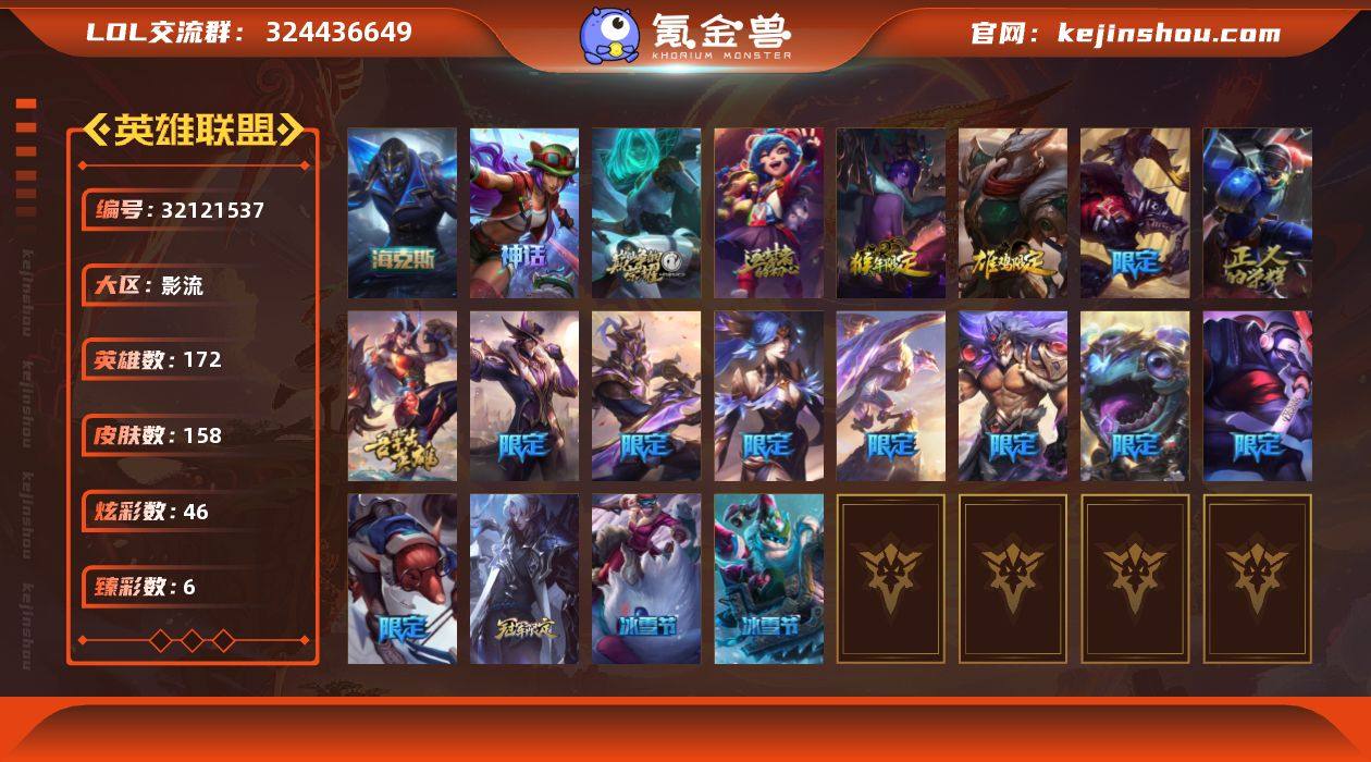 钻石段位-172英雄-158皮肤-46炫彩-0终极-4神话-21限定-18传说-32史诗 【神话皮肤】:十周年纪念安妮,源代码乐芙兰,十五周年纪念希维尔,海克斯科技卡萨丁 【臻彩皮肤】:无畏骑士瑟庄妮赤子初心,泳池派对奥莉安娜优雅珠光鲸,玉剑传说苍鸾丁香,水晶玫瑰斯维因纯洁花蕾,霸天异形卡兹克丛林灾厄 【年限皮肤】:紫金罗刹莫甘娜,司马懿仲达,龙马烈焰波比 【海克斯皮肤】:海克斯科技卡萨丁 【冰雪限定】:邪恶圣诞老人维迦,喜庆之树茂凯,魄罗骑士瑟庄妮 【限定皮肤】:暗杀星慎,SSW图奇,EDG厄斐琉斯,暗裔英雄盖伦,胜利凤凰艾尼维亚,胜利之王泰达米尔,胜利巨口克格莫,胜利女神娑娜,胜利剑圣易,胜利之运崔斯特,胜利女神菲奥娜,都铎王朝图奇,玉剑传说舞龙卫,防暴天使凯尔 【传说皮肤】:地狱之门卫士加里奥,战地机甲厄加特,血石领主弗拉基米尔,大天使长米迦勒凯尔,西部天使艾希,律政大亨蒙多,冰霜之刃艾瑞莉娅,陆地王者4WD布里茨,冰川巨兽墨菲特,丧尸布兰德,源计划净化薇恩,屠龙勇士潘森,死亡骑士盖伦,黯黑魔龙希瓦娜,符文战熊沃利贝尔,金牌主播德莱文,黑夜使者亚索,天煞劫 【史诗皮肤】:特战先锋赵信,侍魂易,月光女神阿忒弥斯索拉卡,源代码索拉卡,兔宝宝提莫,狼外婆沃里克,黑帮狂花厄运小姐,刀锋女王莫甘娜,卡尔萨斯祸害之光,枯萎之壤雷克顿,三昧真火孙悟空,至高之拳李青,地下拳王李青,艳后奈德丽,四神之力乌迪尔,冰川勇者伊泽瑞尔,腥红之月泰隆,刺客信条锐雯,战国大名慎,银河魔装机神菲兹,绞肉机刽子手德莱文,暗星卡兹克,生化骑士德莱厄斯,全金属狂潮杰斯,刀锋女王丽桑卓,源代码丽桑卓,西部牛仔亚索,弗雷尔卓德塔莉垭,源代码卡蜜尔,五星大厨塔姆,霸天剑魔亚托克斯,糖果之王艾翁 【王者皮肤】:五杀摇滚鼓手奥拉夫,霹雳游侠弗拉基米尔 【其他...