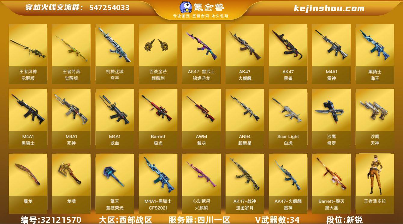 【ky6224】四川一区-39V-3王者武器数-0炫金武器数 【热门武器】:Scar Light-白虎,M4A1-青龙,M4A1-黑骑士,沙鹰-修罗*2 【音效卡】:M4A1-黑骑士音效卡 【皮肤】:雷神-化蛇 皮肤,M4A1-再燃火线,火麒麟-雷神,火麒麟-心动糖果,毁灭-黑大圣皮肤,黑骑士-CFS2021,黑骑士-破界 皮肤,战神-流金岁月皮肤,轻型军用手斧-再燃火线 【角色】:隼,司雨,王者潘多拉,葵-阿尔法武装,暗夜-X,电竞少女,芳心审判者,飞虎队-X,嘉年华灵狐,0号玩家,潘多拉-X,潘多拉-甜心教官,潜龙队-X,青霞仙子,斯沃特-X,兔囡囡,樱-战斗天使,游珑儿 【人偶武器】:AWM-灵狐-15周年嘉年华*2,迷你生化手雷,生化手雷-机甲核心*4,迷你艾比,灵狐娃娃手雷*2 【挑战大师】:冰龙粉碎者-白马银枪,激光毁灭者III-白马银枪 【英雄级武器】:AK47-火麒麟,M4A1-雷神*2,M4A1-黑骑士,M4A1-死神,AN94-超新星,AK47-黑鲨,M4A1-龙血,M4A1-青龙,Scar Light-白虎,黑武士-锦绣游龙,黑骑士-海王,王者芳薇-觉醒版,机械迷城-穹宇,Barrett-极光,AWM-裁决,王者风神-觉醒版,炼狱-悦蓝-觉醒版,沙鹰-修罗*2,沙鹰-天神,屠龙*2,龙啸,擎天-竞技荣光,麒麟刺-百战金芒,高爆手雷-竞技荣光*2,闪光弹-竞技荣光*3,烟雾弹-竞技荣光*4 【道具】:BS战队炫彩背包,CFS限定背包,亚洲杯纪念炫彩背包,炫彩背包,百战金芒炫彩背包,女皇终结者-魔龙之吻,救世主-黑桃战神,黄金生化钩,绿色巨人,灵魂忍者*2,变异宝贝,迷雾幽灵*2,夺命之镰,防化服*3,金色流光-枪王排位*2,星辰流光-枪王排位,枪王排位28赛季金色流光,萌萌小葵表情,EP战队名片,EP战队喷图,EP战队击杀图标,C4-高无钳,防弹头盔*3,防弹衣*3,C4工具钳*3,手雷包*3 【特殊枪械】:1白虎,1黑骑士