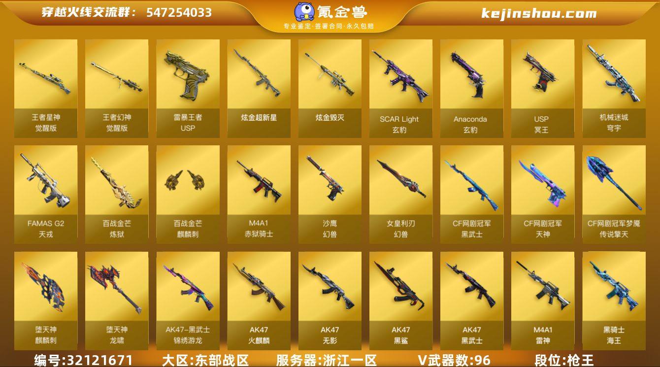 【ky6229】浙江一区-102V-8王者武器数-2炫金武器数 【热门武器】:QBZ03-金色蔷薇,HK417-朱雀,死亡之眼*2,荣耀世冠-火麒麟,白虎-电玩蓝兔,毒蜂,M4A1-黑骑士*3,加特林-炼狱,羊驼玩偶,白虎-枪娘安妮,幼崽虎,火麒麟-绝迹,沙鹰-修罗*5,荣耀世冠-龙啸,高爆手雷-幻兽 【王者炫金武器】:USP-雷暴王者*2,王者冰锋,炫金超新星,炫金毁灭 【音效卡】:M4A1-黑骑士音效卡,Barrett-毁灭音效卡,AWM-裁决音效卡,Barrett-碧霄极光音效卡,炼狱-百战金芒-庆典舞曲音效卡 【皮肤】:幻神-AG-CFPL S24冠军 皮肤,白虎-白鲨-CFPLS23冠军,QBZ03-传奇宠儿,AWM-裁决-凤灵皮肤,裁决-巅峰荣耀 皮肤,裁决-运输船 皮肤,雷神-传奇N9,雷神-维纳斯皮肤,M4A1-再燃火线,雷神-神秘按键 皮肤,火麒麟-平天大圣,毁灭-神秘黑洞皮肤,毁灭-英雄计划 皮肤,黑龙-能量核心,战神-粉色甜心皮肤,战神-紫绶金章皮肤,战神-流金岁月皮肤,天龙-能量核心,AWM-再燃火线,轻型军用手斧-再燃火线,擎天-秘银,麒麟刺-荣耀世冠白鲨 【角色】:迷迭香,玄豹,零·纪元,战地猎狐,王者玲珑,葵-阿尔法武装,幻面灵狐,暗夜-X,初恋灵狐,风暴女,兰-海滩派对,兰-新年限定,兰妹妹,灵狐者-X,灵狐者-黄金海岸,龙儿,麻雀,曼陀罗-礼服,玫瑰花神,潘多拉-X,潘多拉-甜心教官,潜龙队-X,蜀雪,新娜塔莎,雪莉杨 【人偶武器】:火麒麟-绝迹,白虎-枪娘安妮,HK417-朱雀-枪娘菲,超新星-枪娘安琪儿,金色蔷薇-枪娘阿敏,巴雷特-零-水下丽影,跳跳鲨,幼崽虎,AWM-灵狐-15周年嘉年华,M37-葵,COP-旗袍,迷你牛魔王,闪光弹-小乔,迷你艾比 【暴走生化】:毒蜂,死亡之眼*2 【挑战大师】:AK47-冰龙粉碎者,激光毁灭者III-白马银枪,VEPR-12-金魔 【英雄级武器】:AK47-火麒麟,M4A1-黑龙,M4A1-雷神,M4A1-黑骑士*3,AK47-无影,AK47...