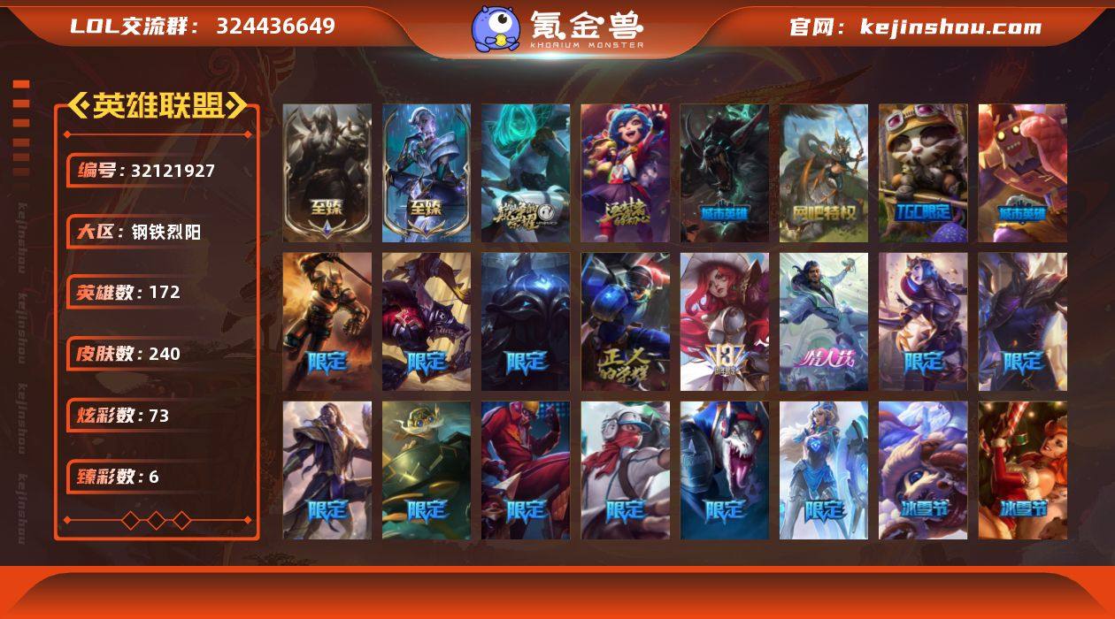 未定级段位-172英雄-240皮肤-73炫彩-0终极-6神话-34限定-22传说-60史诗 【神话皮肤】:十周年纪念安妮,源代码乐芙兰,至臻北极星钢影卡蜜尔,至臻腥红之月亚托克斯 【珍稀头像】:星守阿狸头像 【至臻皮肤】:至臻暗裔英雄嘉文四世,至臻永恒星灵佐伊,至臻北极星钢影卡蜜尔,至臻腥红之月亚托克斯 【臻彩皮肤】:无畏骑士瑟庄妮赤子初心,西部魔影卢锡安贝利尔之怠,星之守护者阿卡丽未来之光,魔女阿卡丽虚荣,净雪之月莫甘娜冬虹,墨之影武者永恩灵墨刻影 【年限皮肤】:龙马烈焰波比 【情人节限定】:觅心女王艾希,水晶玫瑰阿克尚 【冰雪限定】:幸福女神乐芙兰,圣诞狂欢努努和威朗普,圣诞糖果棒厄运小姐,阿木木“主人不要我了”,胡桃夹子萨科,喜庆之树茂凯,雪默丁格,冰雪兽纳尔 【限定皮肤】:冠军之隐劫,Fnatic库奇,SKTT1李青,SSW辛吉德,SKTT1雷克顿,DWG蕾欧娜,女帝厄运小姐,暗裔英雄盖伦,胜利女神奥莉安娜,胜利之剑亚托克斯,胜利枪神卢锡安,海贼瑞兹,泳池派对蕾欧娜,泳池派对李青,蒙多蒙多,密林猎手提莫,暗影沃里克,奥德赛吉格斯,野兽猎人瑟庄妮,都铎王朝图奇,防暴天使凯尔,警用试作体K9内瑟斯 【传说皮肤】:魔幻卡牌崔斯特,血石领主弗拉基米尔,大天使长米迦勒凯尔,墨之影武者易,烈焰雄心崔丝塔娜,女皇艾希,源计划联合艾希,至尊魔女莫甘娜,未来战士凯特琳,神拳李青,源计划净化薇恩,炼狱魔犬内瑟斯,钢铁军团盖伦,黎明使者锐雯,冰霜亚龙希瓦娜,苍穹之光韦鲁斯,灌篮高手德莱厄斯,黑夜使者亚索,星之守护者金克丝,西部魔影卢锡安,真实伤害艾克,源计划毁灭派克 【史诗皮肤】:腥红之月崔斯特,天人合一易,铁血剑豪易,战争机器赛恩,圣洁化身索拉卡,熊猫提莫,女船长厄运小姐,百夫长贾克斯,熔火之心拉莫斯,飞越疯人院萨科,掠星魔刃卡萨丁,海克斯科技迦...