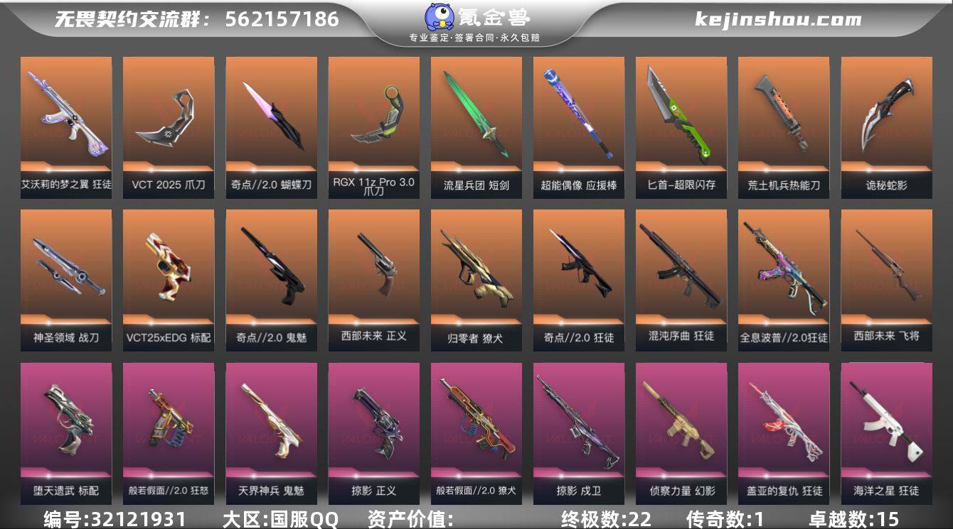 【套装】:VCT 2025 赛季套装,奇点//2.0套装,掠影套装,般若假面//2.0套装 【英雄】:幻棱,炼狱,维斯,暮蝶,钛狐,壹决,铁臂,捷风,雷兹,幽影,不死鸟,贤者,猎枭,蝰蛇,零,芮娜,奇乐,尚勃勒,霓虹,夜露,K/O,盖可 【近战武器】:近战武器-奇点//2.0 蝴蝶刀,近战武器-VCT 2025 爪刀,近战武器-RGX 11z Pro//3.0 爪刀,近战武器-黑波之刃,近战武器-威龙之刃,近战武器-鬼丸国纲,近战武器-源始幻刃,近战武器-流星兵团 短剑,近战武器-超能偶像 应援棒,近战武器-超限闪存 匕首,近战武器-荒土机兵 热能刀,近战武器-影刃,近战武器-诡秘蛇影 军刀,近战武器-神圣领域 战刀 【狂徒】:狂徒-混沌序曲,狂徒-奇点//2.0,狂徒-全息波普//2.0,狂徒-艾沃莉的梦之翼,狂徒-般若假面//2.0,狂徒-掠影,狂徒-盖亚的复仇,狂徒-海洋之星,狂徒-离子武器//2.0,狂徒-超能偶像,狂徒-荒土机兵,狂徒-流星兵团,狂徒-诡秘蛇影 【幻影】:幻影-侦察力量,幻影-超限闪存,幻影-神圣领域,幻影-聚合之力,幻影-纳米打击,幻影-末日之翼 【戍卫】:戍卫-掠影,戍卫-超能偶像,戍卫-浮光跃金,戍卫-逆冲蛮牛,戍卫-战术熊与伙伴们,戍卫-月球哨兵,戍卫-折光棱晶 【獠犬】:獠犬-归零者,獠犬-般若假面//2.0,獠犬-神圣领域,獠犬-采蜜小蜂队,獠犬-模拟赫兹,獠犬-逆冲蛮牛 【冥驹】:冥驹-掠影,冥驹-离子武器,冥驹-荒土机兵,冥驹-模拟赫兹,冥驹-星云暗涌 【飞将】:飞将-西部未来,飞将-聚合之力,飞将-战术熊与伙伴们,飞将-末日之翼 【莽侠】:莽侠-超限闪存,莽侠-诡秘蛇影,莽侠-纤云弄巧,莽侠-月球哨兵 【战神】:战神-般若假面//2.0,战神-神圣领域,战神-采蜜小蜂队,战神-浮光跃金 【奥丁】:奥丁-流星兵团,奥丁-纳米打击,奥丁-末日之翼 【判官】:判官-超能偶像,判官-诡秘蛇影,判官-采蜜小蜂...