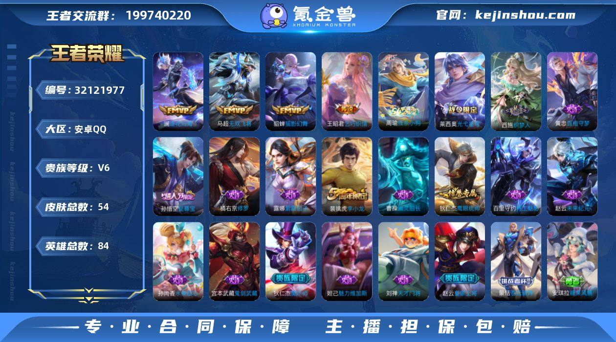 安卓Q-V6-最强王者段位-84英雄-54皮肤-4传说-17史诗【传说皮肤】:澜逐花归海,马超无双飞将,王昭君乞巧织情,貂蝉猫影幻舞【限定皮肤】:狄仁杰阴阳师,赵云皇家上将,狄仁杰魔术师,项羽海滩派对,孙悟空至尊宝,裴擒虎李小龙【赛季限定】:甄姬逆浪荇歌,亚瑟荣光之誓【战令限定】:莱西奥光弋星穹,明世隐往忆晖光,周瑜线条小狗【史诗皮肤】:周瑜线条小狗,莱西奥光弋星穹,西施织梦人,黄忠百相守梦,裴擒虎李小龙,橘右京修罗,狄仁杰鹰眼统帅,刘禅天才门将,百里守约特工魅影,孙悟空至尊宝,曹操幽灵船长,妲己魅力维加斯,孙尚香水果甜心,宫本武藏鬼剑武藏,狄仁杰魔术师,赵云未来纪元,赵云皇家上将,露娜紫霞仙子【其他皮肤】:蒙恬苍云破阵,安琪拉糖果风暴,虞姬溯影追猎,蚩奼极光幻客,明世隐往忆晖光,亚瑟荣光之誓,鬼谷子克喵,莱西奥踏浪烽翎,庄周锦麟游梦,甄姬逆浪荇歌,白起死霸装,姬小满小满鸭,露娜命运加冕,吕布野性能量,大乔守护之力,诸葛亮掌控之力,孙尚香沉稳之力,狄仁杰阴阳师,花木兰兔女郎,亚瑟死亡骑士,典韦黄金武士,宫本武藏未来纪元,赵云忍炎影,项羽海滩派对,马超幸存者,曜归虚梦演,盘古创世神祝,弈星踏雪寻梅,马可波罗激情绿茵,雅典娜战争女神,兰陵王隐刃,后羿精灵王【营地ID】:1531974485