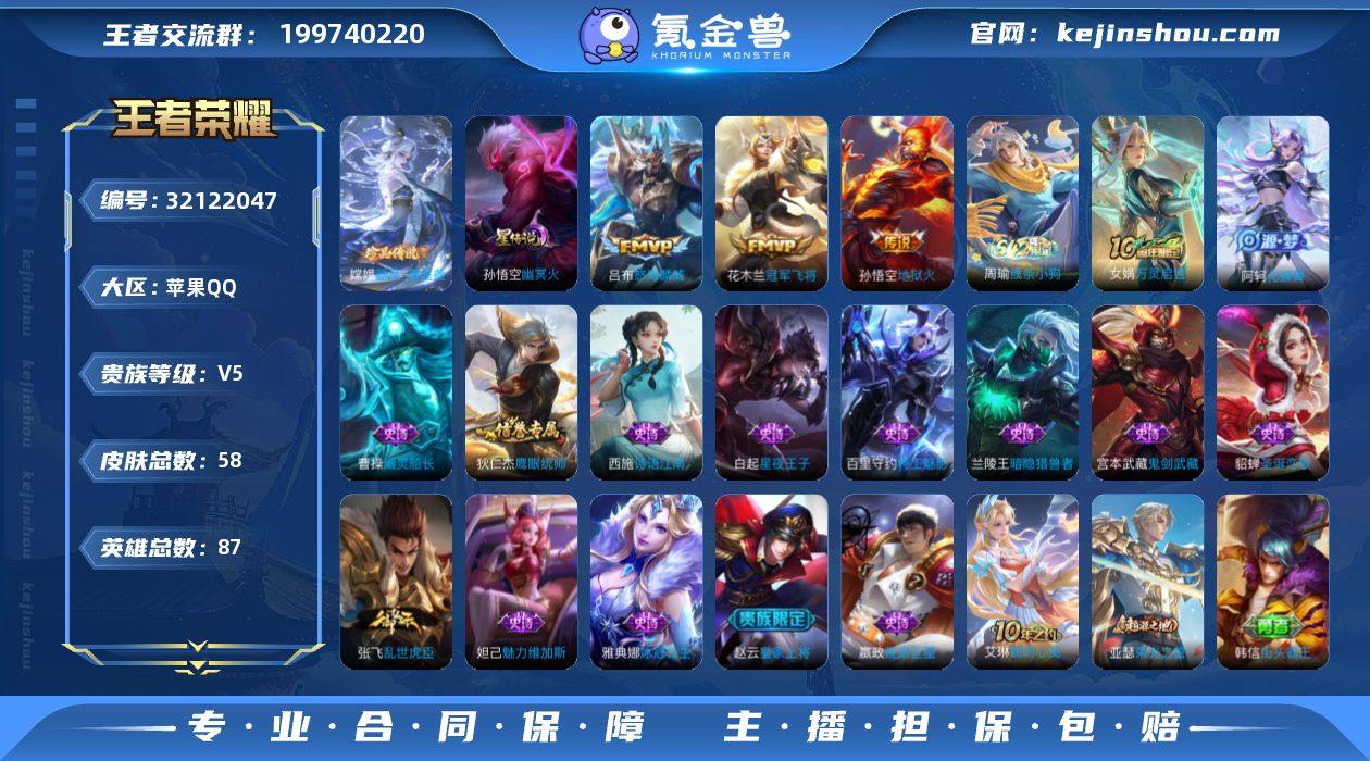 苹果Q-V5-至尊星耀I段位-87英雄-58皮肤-1无双-1珍品传说-3传说-15史诗【无双皮肤】:李信问心剑【珍品传说】:嫦娥器灵落星盏【传说皮肤】:吕布怒海麟威,花木兰冠军飞将,孙悟空地狱火【限定皮肤】:狄仁杰阴阳师,赵云皇家上将,项羽海滩派对,沈梦溪龙舞盛年,刘邦剑破天穹【赛季限定】:刘邦剑破天穹,太乙真人谧流熔炉,亚瑟荣光之誓【战令限定】:周瑜线条小狗【史诗皮肤】:周瑜线条小狗,女娲万灵启世,阿轲化蝶舞,西施诗语江南,狄仁杰鹰眼统帅,白起星夜王子,百里守约特工魅影,雅典娜冰冠公主,兰陵王暗隐猎兽者,张飞乱世虎臣,曹操幽灵船长,妲己魅力维加斯,嬴政摇滚巨星,宫本武藏鬼剑武藏,貂蝉圣诞恋歌,赵云皇家上将【其他皮肤】:艾琳鹤鸣心笺,亚瑟荣光之誓,戈娅玫蓝誓约,西施雪境奇遇,太乙真人谧流熔炉,刘邦剑破天穹,沈梦溪龙舞盛年,海月幻泉雾影,吕布野性能量,李白敏锐之力,诸葛亮掌控之力,孙尚香沉稳之力,刘备汉昭烈帝,狄仁杰阴阳师,宫本武藏万象初新,花木兰兔女郎,达摩拳王,亚瑟死亡骑士,典韦黄金武士,韩信街头霸王,项羽海滩派对,云缨赤焰之缨,嫦娥露花倒影,李信灼热之刃,弈星踏雪寻梅,明世隐占星师,百里守约绝影神枪,铠龙域领主,干将莫邪第七人偶,诸葛亮星航指挥官,杨戬埃及法老,马可波罗激情绿茵,兰陵王隐刃,周瑜海军大将,孙悟空西部大镖客,钟无艳生化警戒,项羽帝国元帅【营地ID】:1564672975【星元皮肤】:孙悟空幽冥火