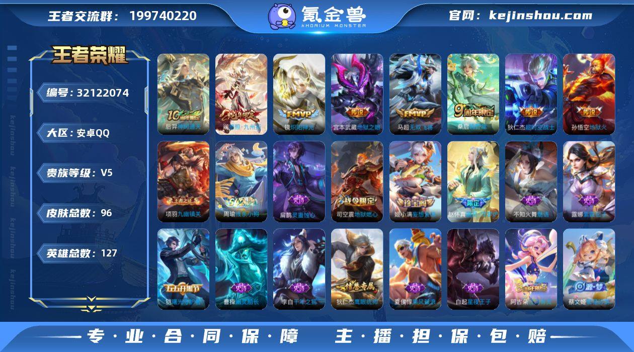 安卓Q-V5-最强王者段位-127英雄-96皮肤-8传说-30史诗【传说皮肤】:后羿神树通天,澜愿照九州拓,桑启鸣野蒿,马超无双飞将,镜炽阳神光,宫本武藏地狱之眼,孙悟空地狱火,狄仁杰超时空战士【限定皮肤】:蒙犽顽岩魄,姜子牙天穹之誓,狄仁杰阴阳师,赵云皇家上将,狄仁杰万华元夜,项羽海滩派对,程咬金演武夺筹,钟馗驱傩正仪,蔡文姬繁星吟游,百里玄策原初追逐者,裴擒虎擒涛扼浪,艾琳流音漫舞,司空震地狱燃心,阿古朵江河有灵,张良古海寻踪,鬼谷子天穹祈灯,姬小满妄想食味,刘邦剑破天穹,程咬金群星魔术团,镜青焰无极,项羽苍威无极,周瑜熔金海岸【年限皮肤】:澜愿照九州拓【赛季限定】:狄仁杰万华元夜,程咬金演武夺筹,钟馗驱傩正仪,裴擒虎擒涛扼浪,张良古海寻踪,鬼谷子天穹祈灯,刘邦剑破天穹,姜子牙天穹之誓,东皇太一噬灭天穹,太乙真人谧流熔炉,钟馗虚灵犬护,甄姬逆浪荇歌,亚瑟荣光之誓,百里玄策原初追逐者,牛魔星界战将,项羽九幽镇关【战令限定】:司空震地狱燃心,艾琳流音漫舞,镜青焰无极,项羽苍威无极,周瑜线条小狗【史诗皮肤】:钟馗锁墨魂,周瑜线条小狗,项羽九幽镇关,扁鹊灵蛊蚀心,赵怀真器灵浮梦炉,牛魔星界战将,蒙犽顽岩魄,镜青焰无极,姬小满妄想食味,阿古朵江河有灵,司空震地狱燃心,百里玄策原初追逐者,不知火舞魅语,蔡文姬繁星吟游,狄仁杰鹰眼统帅,大乔猫狗日记,白起星夜王子,铠曙光守护者,小乔缤纷独角兽,夏侯惇乘风破浪,刘邦德古拉伯爵,张飞乱世虎臣,李白千年之狐,曹操幽灵船长,妲己魅力维加斯,嬴政暗夜贵公子,孙尚香水果甜心,宫本武藏鬼剑武藏,廉颇地狱岩魂,赵云皇家上将,露娜紫霞仙子【其他皮肤】:蚩奼极光幻客,艾琳鹤鸣心笺,亚瑟荣光之誓,哪吒罗小黑战记,甄姬逆浪荇歌,钟馗虚灵犬护,明世隐景韶洛都,西施雪境奇遇,太乙...