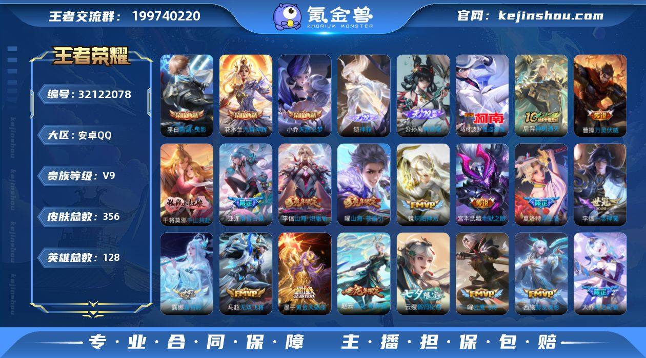 安卓Q-V9-至尊星耀II段位-128英雄-356皮肤-3典藏皮肤-2无双-1珍品传说-33传说-107史诗【英雄全皮】:孙权全皮,夏洛特全皮,空空儿全皮,影全皮【荣耀典藏】:小乔天鹅之梦,李白鸣剑曳影,花木兰九霄神辉【无双皮肤】:铠神罪,公孙离离恨烟【珍品传说】:马可波罗怪盗基德【传说皮肤】:后羿神树通天,曹操万灵伏威,干将莫邪千山共赴,嬴政玄雷天君,王昭君映山客,桑启鸣野蒿,云中君群星魔术团,墨子黄金天蝎座,亚连落雪白狼,吕布曦玄引,貂蝉曦玄引,赵云乘龙铭钟鼎,露娜霜月吟,大乔时之奇旅,云缨鹤归松栖,夏洛特浮生妄,花木兰燃星之曲,曜山海苍雷引,李信山海炽霜斩,吕布怒海麟威,马超无双飞将,孙策末日机甲,西施游龙清影,镜炽阳神光,虞姬启明星使,曜云鹰飞将,李信一念神魔,貂蝉猫影幻舞,干将莫邪久胜战神,花木兰冠军飞将,后羿黄金射手座,宫本武藏地狱之眼,孙悟空地狱火【限定皮肤】:公孙离离恨烟,蔡文姬夏日便利店,虞姬夏日便利店,姜子牙天穹之誓,杨戬破阵退雄兵,狄仁杰阴阳师,赵云皇家上将,嬴政优雅恋人,高渐离玩趣恶龙,钟无艳超时空战士,扁鹊奇幻香踪,白起夜都怪侠,芈月重明,芈月幻夜卜梦,元歌无心,夏侯惇朔风刀,甄姬落雪兰心,曹操烛龙,典韦穷奇,狄仁杰魔术师,狄仁杰万华元夜,达摩沙漠行僧,项羽海滩派对,老夫子醍醐杖,程咬金演武夺筹,露娜一生所爱,韩信逐梦之影,王昭君午后时光,兰陵王金庭之子,花木兰默契交锋,花木兰燃星之曲,孙悟空至尊宝,孙悟空孙行者,后羿圣弓游侠,李元芳云中旅人,虞姬启明星使,钟馗神迹守卫,钟馗驱傩正仪,杨玉环遇见飞天,杨戬潮玩骑兵,干将莫邪真爱魔法,雅典娜黎明之约,太乙真人饕餮,鬼谷子原初探秘者,鬼谷子五谷丰年,大乔时之奇旅,黄忠火炮绅士,苏烈千军破阵,弈星混沌棋,梦奇顽趣,沈梦溪大漠名商,明世...