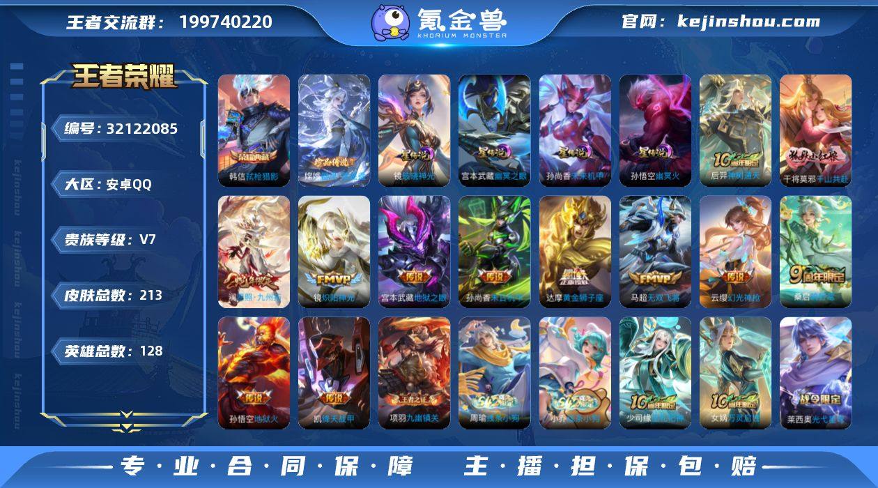 安卓Q-V7-最强王者段位-128英雄-213皮肤-1典藏皮肤-1珍品传说-13传说-55史诗【英雄全皮】:孙权全皮,敖隐全皮,戈娅全皮,空空儿全皮,影全皮【荣耀典藏】:韩信弑枪猎影【珍品传说】:嫦娥器灵落星盏【传说皮肤】:马超神骥逐星野,后羿神树通天,干将莫邪千山共赴,澜愿照九州拓,云缨幻光神枪,桑启鸣野蒿,马超无双飞将,铠绛天战甲,镜炽阳神光,达摩黄金狮子座,孙尚香末日机甲,宫本武藏地狱之眼,孙悟空地狱火【限定皮肤】:虞姬夏日便利店,姜子牙天穹之誓,狄仁杰阴阳师,赵云皇家上将,高渐离玩趣恶龙,元歌云间偶戏,元歌无心,马可波罗暗影游猎,狄仁杰魔术师,项羽海滩派对,孙悟空美猴王,苏烈千军破阵,百里玄策原初追逐者,裴擒虎李小龙,裴擒虎擒涛扼浪,西施玲珑珍味,鲁班大师探海日志,戈娅驭风魔法,艾琳女武神,阿古朵江河有灵,张良古海寻踪,蒙犽百解令,鬼谷子天穹祈灯,沈梦溪龙舞盛年,刘邦剑破天穹,程咬金群星魔术团,项羽苍威无极,周瑜熔金海岸【年限皮肤】:孙悟空美猴王,澜愿照九州拓【赛季限定】:苏烈千军破阵,裴擒虎擒涛扼浪,鲁班大师探海日志,张良古海寻踪,鬼谷子天穹祈灯,刘邦剑破天穹,姜子牙天穹之誓,东皇太一噬灭天穹,太乙真人谧流熔炉,钟馗虚灵犬护,甄姬逆浪荇歌,亚瑟荣光之誓,百里玄策原初追逐者,项羽九幽镇关【战令限定】:马可波罗暗影游猎,元歌云间偶戏,戈娅驭风魔法,西施玲珑珍味,项羽苍威无极,虞姬夏日便利店,百里守约百相守梦,老夫子百相守梦,孙膑茶境仙,马超访茗客,刘禅鸭鸭历险记,沈梦溪鸭鸭历险记,周瑜百相守梦,孙策百相守梦,莱西奥光弋星穹,明世隐往忆晖光,周瑜线条小狗,小乔线条小狗【史诗皮肤】:周瑜线条小狗,小乔线条小狗,项羽九幽镇关,少司缘巫礼祀神,女娲万灵启世,莱西奥光弋星穹,公孙离涂山容容,黄忠百相守...